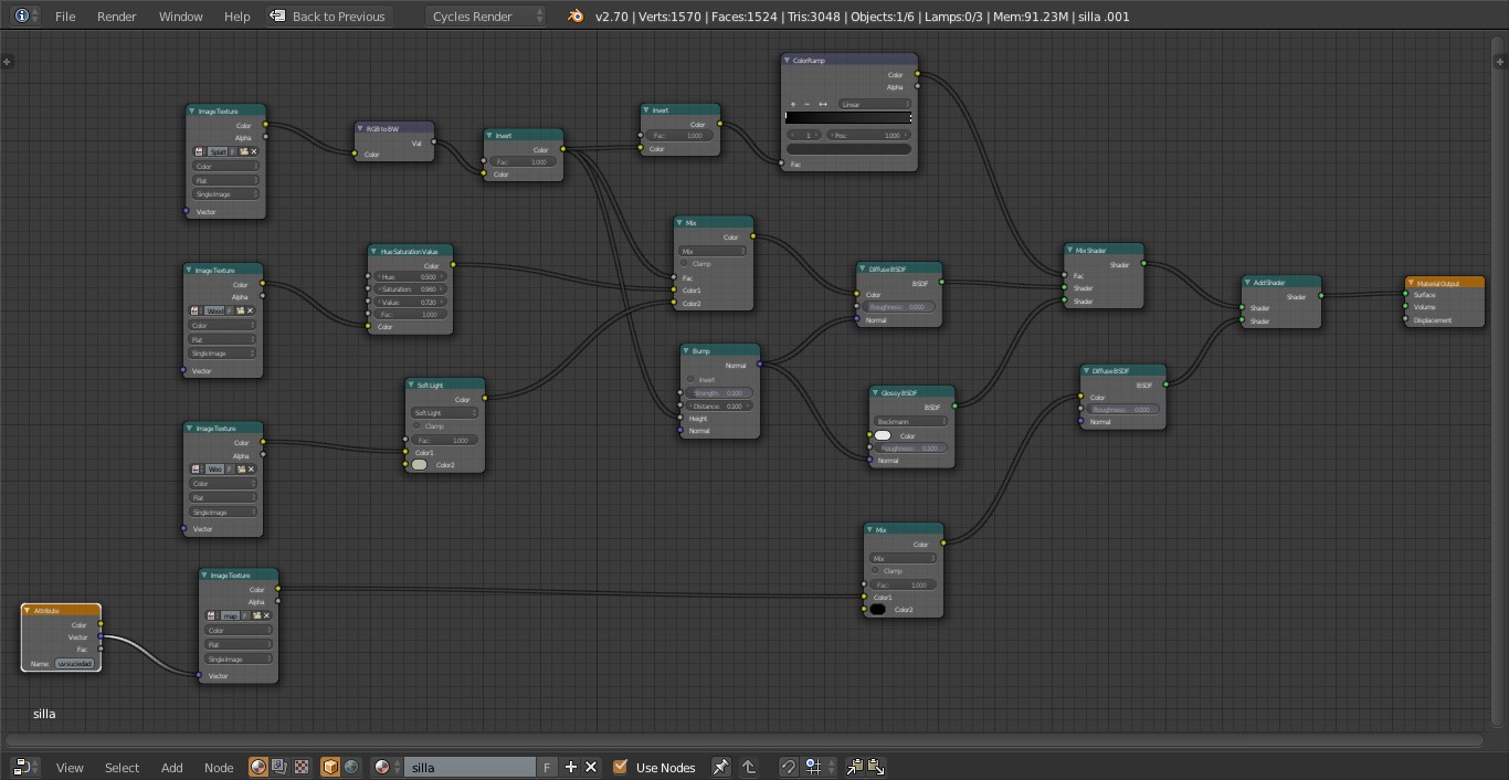 Es cantidad de nodos me parece muy excesiva para ese material. Piensa qué a más nodos, más tiempo de render, así que, conviene reducirlos. He hecho una prueba de lo que podría ser un taburete desgastado: