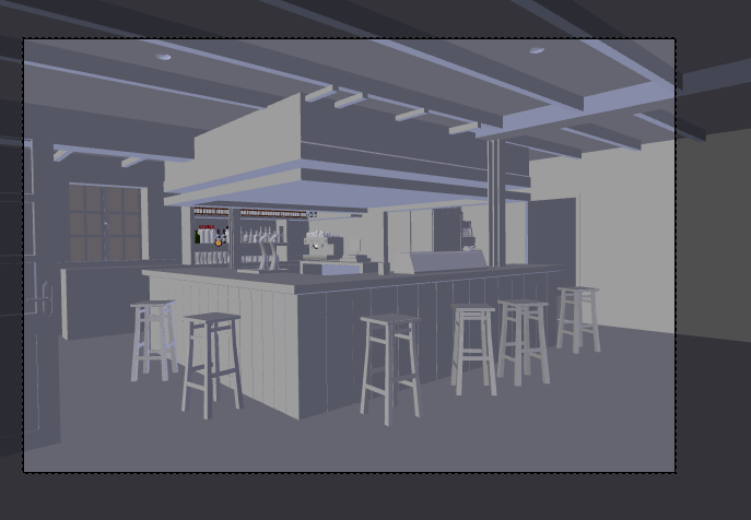 - En la barra se ve un reflejo blanco, como si viniera de enfrente. ¿Esta abierta esa pared? Podría ser el world. Ciérrala y pon una ventana (da la impresión de que hay una, por el reflejo en la imagen original). Como lo tienes le da un toque blanquecino y no cálido como el original.