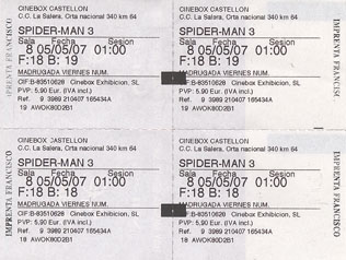 5.90 euros. Y yo que me quejo de los precios de por aquí.andan entre los 3.5 euros (50 pesos mex). Y pensándolo bien, mejor voy el domingo a la Matine ya que es más barato (2 euros aproximadamente) va menos gente y me puedo comprar mi vaso de Spiderman 3.