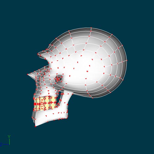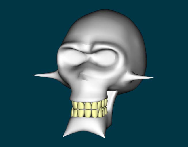 La mandíbula también está un poco cargada de Splines, pues al carecer de piel, el movimiento de la boca se reduce a cerrar y abrir la boca, pero al agregarle un stretch/Squash a la mandíbula se compensa y se logra un hablar muy fluido muy parecido a un personaje ton y no queda duro.