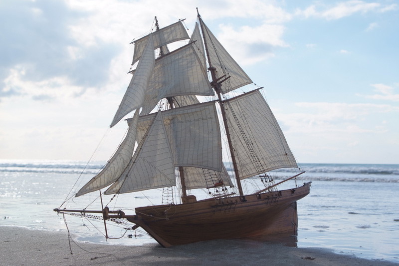 Yy ya está, creo que para resultar verdaderamente convincente tienes que pensar en la imagen como en una ecuación: la imagen digital es una matriz de colores, hay que imaginar que es un sistema de ecuaciones donde al resolverla encuentras los valores que tendría en la realidad una fotografía de un velero de tamaño real en un mar real con arena real e iluminación real. Sólo tienes que encajar tu maqueta reajustando las ecuaciones y obteniendo un comportamiento natural (una solución buena) para el resto de píxels de la imagen.