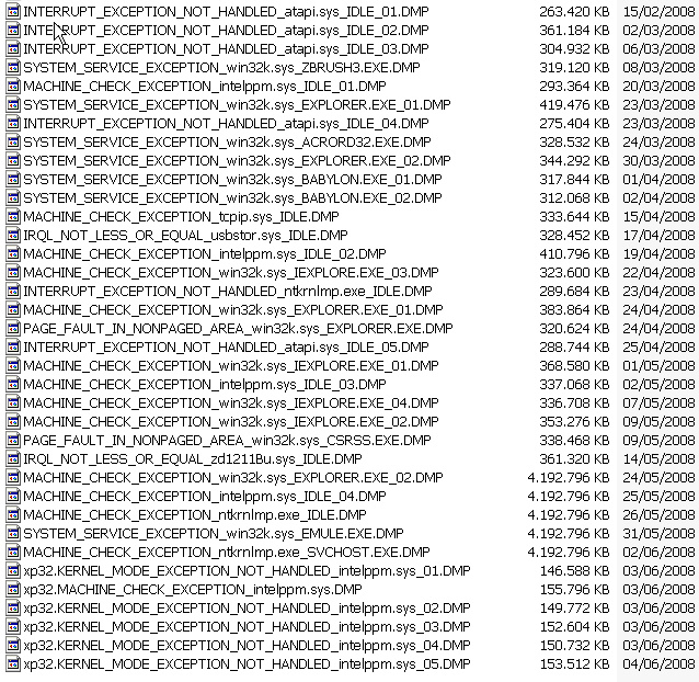 Como últimamente tengo más tiempo, el domingo se me ocurrió volver a formatear y hacer dos particiones en el Hd nuevo, en una puse el XP solo con lo justo, los programas de diseño y 3d, sin antivirus ni conexión. Y en la otra el XP32 para conectarme a internet, con todo instalado. El XP no me ha saltado aún, pero en el XP32 es un no parar: tres o cuatro veces al día y ahora uno nuevo kernel_mode_exception_not_handled causado por intelppm, Sys.