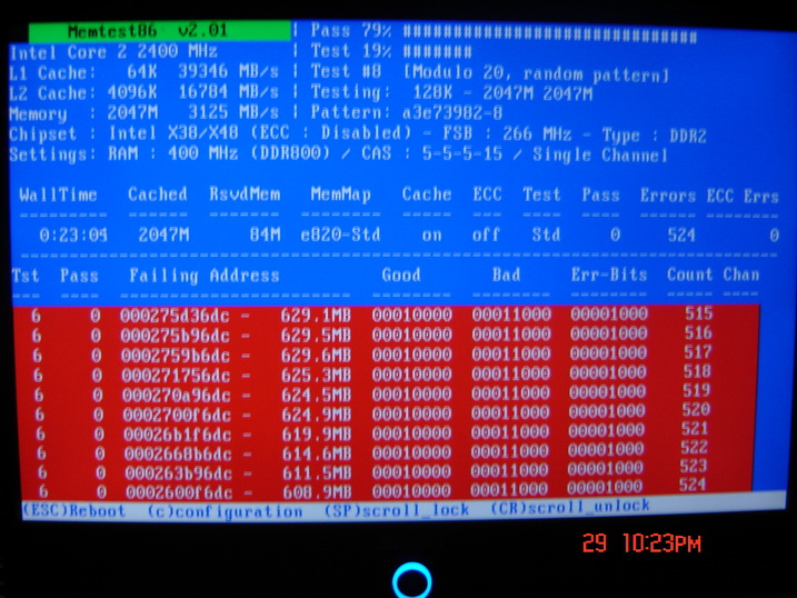 Saco el módulo chungo y meto el sano en otro slot, enciendo el ordenador y a los cinco minutos me vuelve a saltar el pantallazo. Toma castaña. (y dando gracias por que saltase tan pronto, podría haber estado dos días pensando que lo había encontrado) ¿cómo se explica esto? He testeado la memoria sana durante ocho horas y no me da errores. También he testeado la memoria chunga con los programas y versiones anteriores del memtest que me la daban sana y -¡ahora.- Me la detectan con errores.
