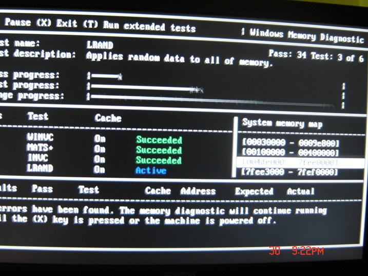 El domingo pasado, como tenía que salir, se me ocurrió dejar uno de los módulos con el memtest86+, ya estaban más que testeados: los dos juntos durante muchas horas con memtest, goldmem y otros. Y por separado, seis horas cada modulo con window memory diagnostic tool. Ninguno me detectaba ni un error. También había comprobado que estos pantallazos me saltaban con solo un módulo insertado y en diferentes slots (sin contar con que hace ya unos meses probé con un módulo de Kingston durante una semana). Vamos, que la Ram era casi lo único que había descartado.