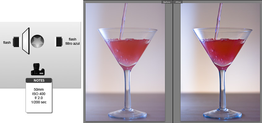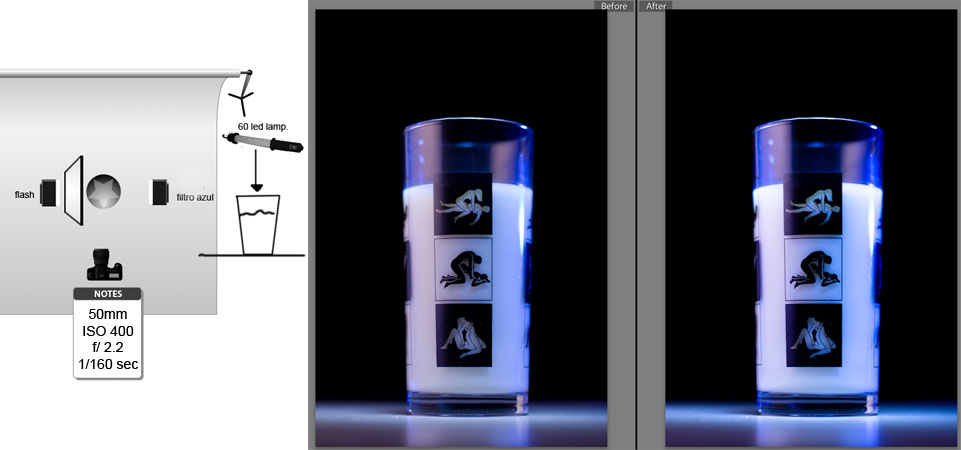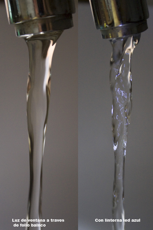 Las del grifo una es con la luz natural de la ventana a través de un folio blanco y la otra con un led linterna azul apuntando al chorro.