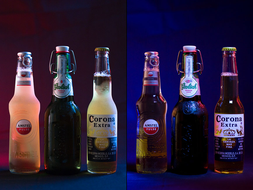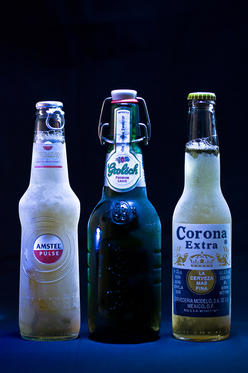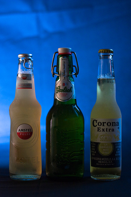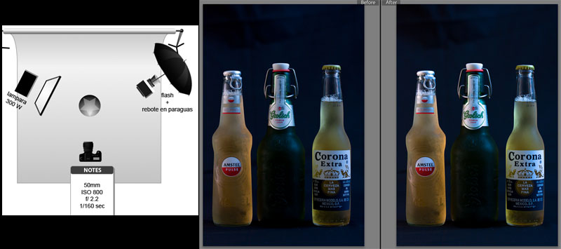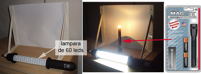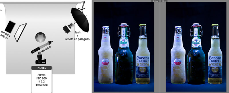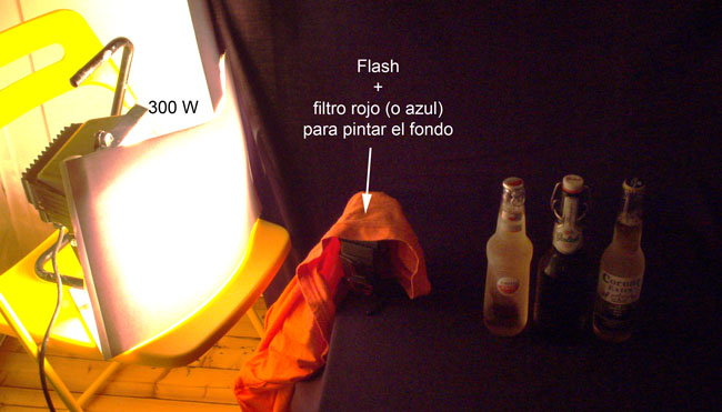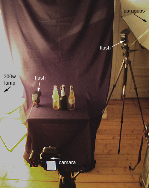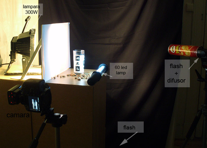 Espero que más o menos se entienda el setup de luces, no recuerdo muy bien todas las variantes, además de las fuentes de luz principal también he jugado con la linterna Maglite(en la última fotografía, por ejemplo, detrás de la botella verde) y la linterna de 60 leds.