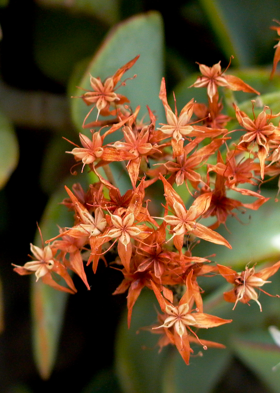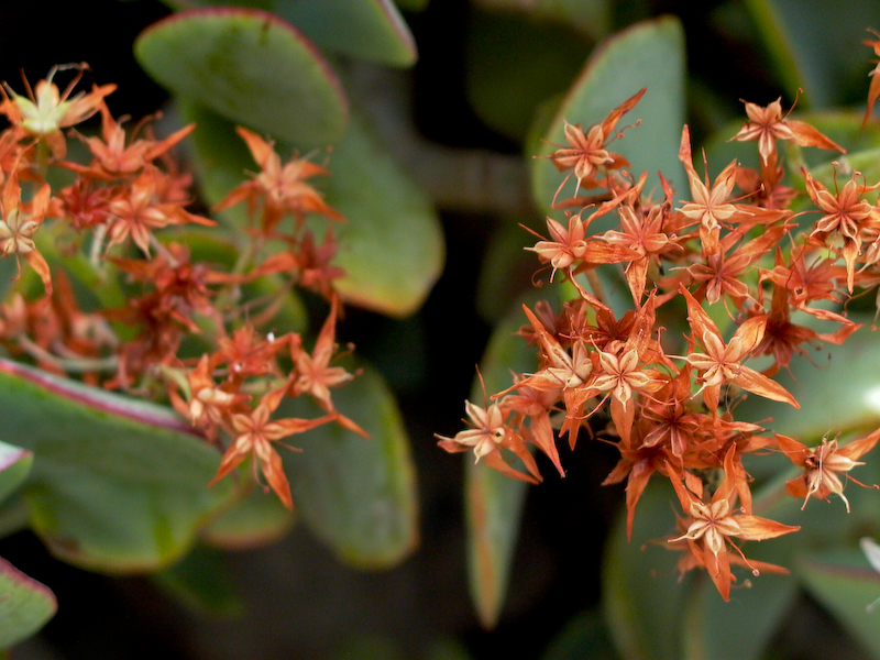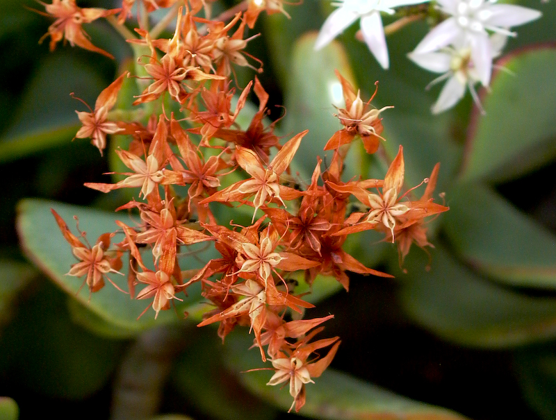Flor de la crasula. Nunca la había visto florecida. Me gustan más cuando empiezan a secarse. Cambian del blanco al naranja.