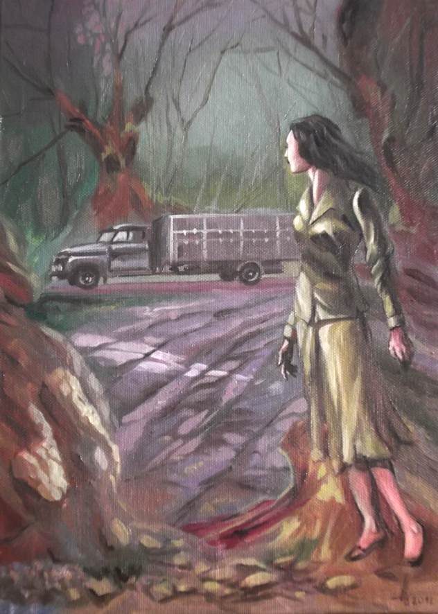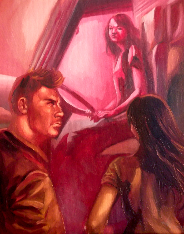 Ilustración capítulo 31 para la novela punta de pistola. Óleo sobre cartón, 27x22cm.