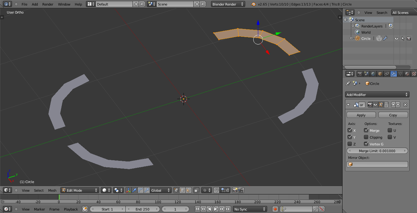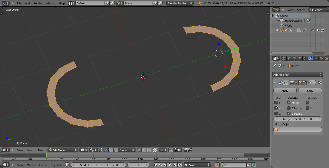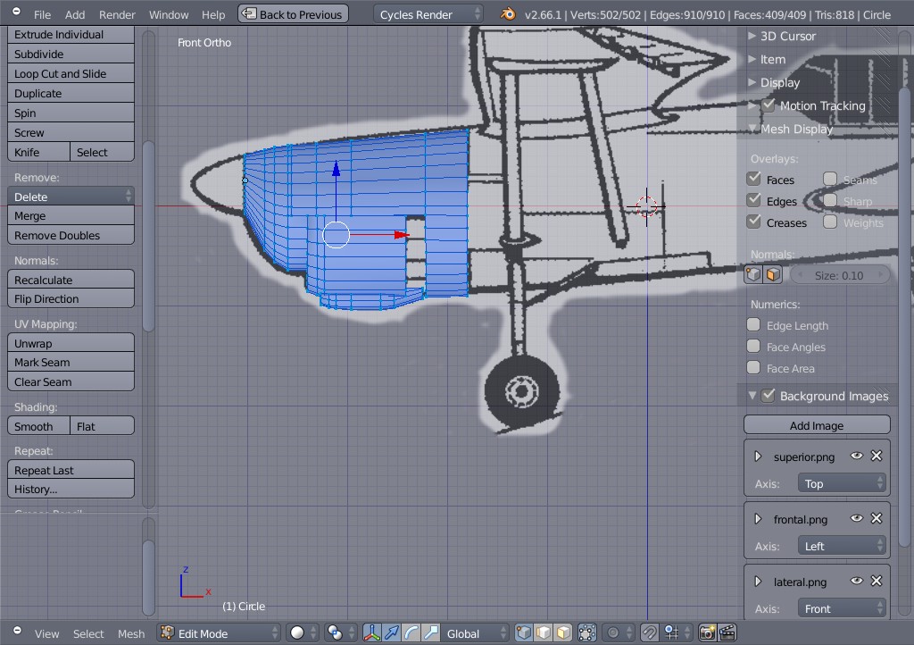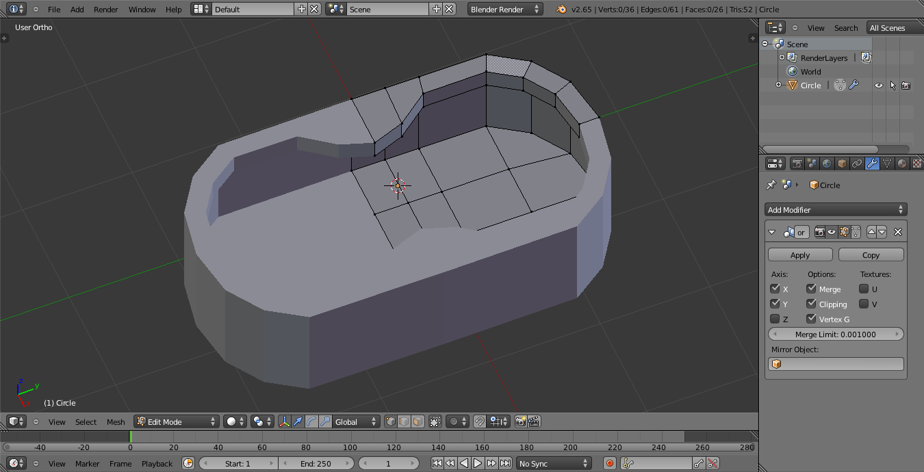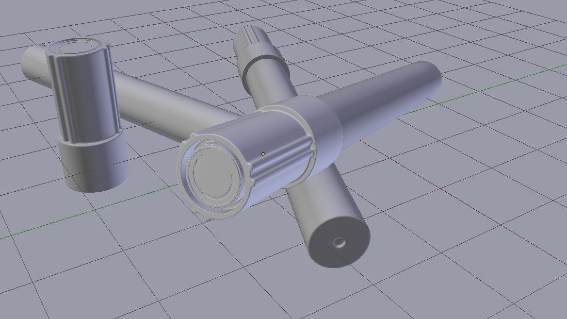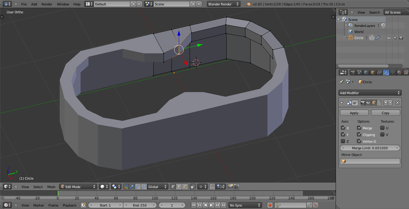 Hola. Tengo un problema que no entiendo. He empezado el sable láser de nuevo, esta vez he hecho primero el contorno de las gomas de la empuñadura con un plano y el modificador mirror, luego le he añadido un círculo Bézier, además de eso también le he añadido un círculo normal para ponerle una cara (f) una vez hecho esto he unido los objetos Control +, y a continuación lo he extruido para hacer el mango.
