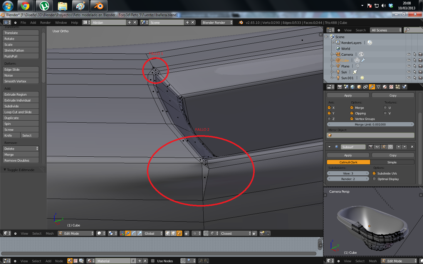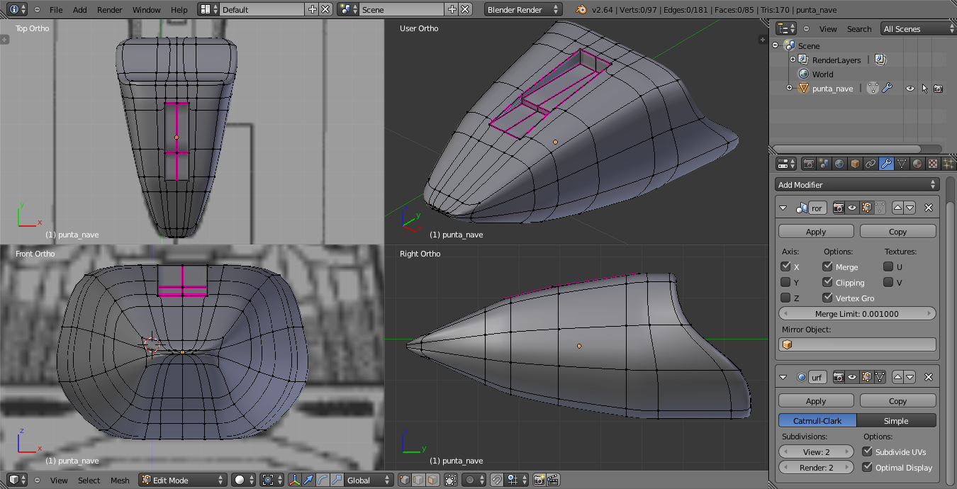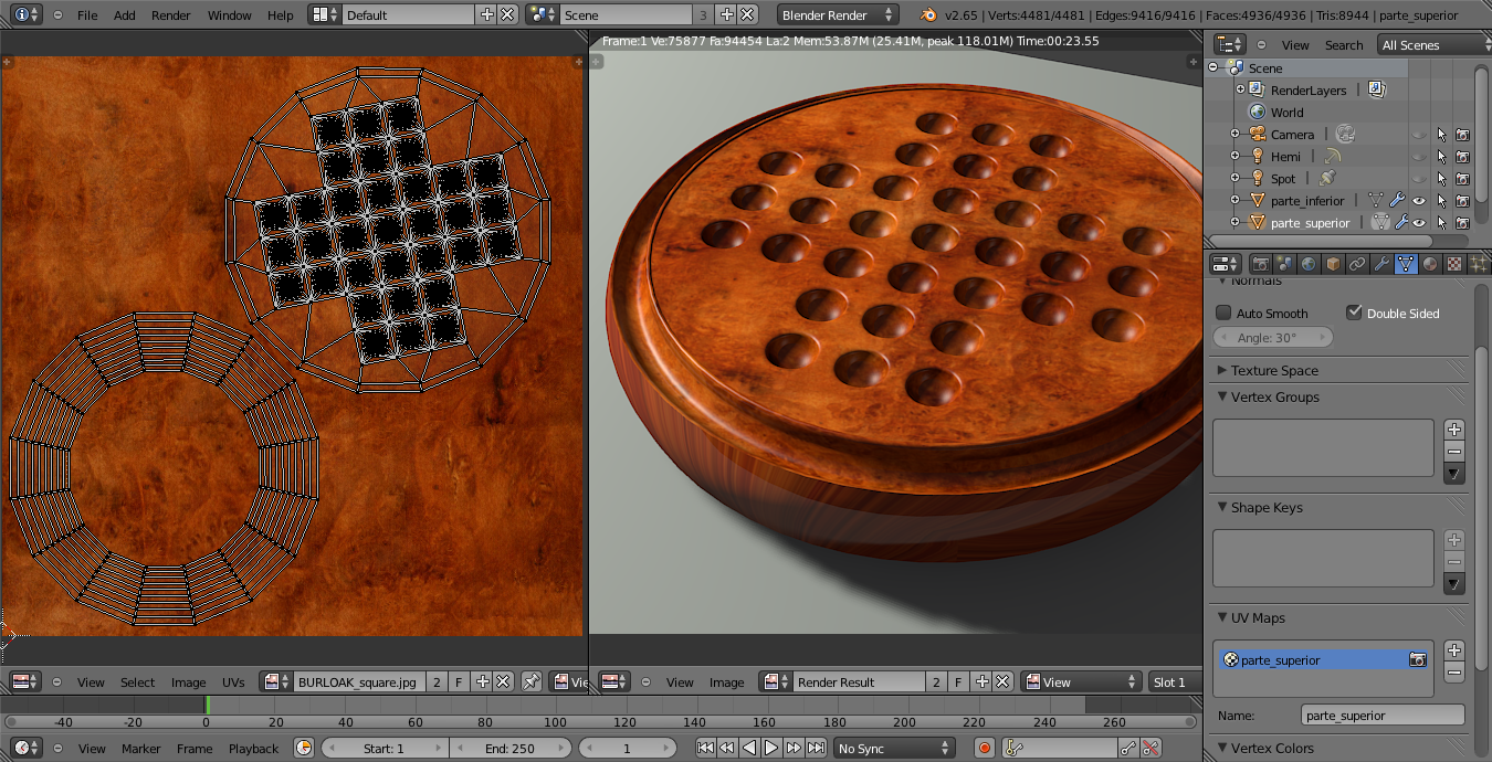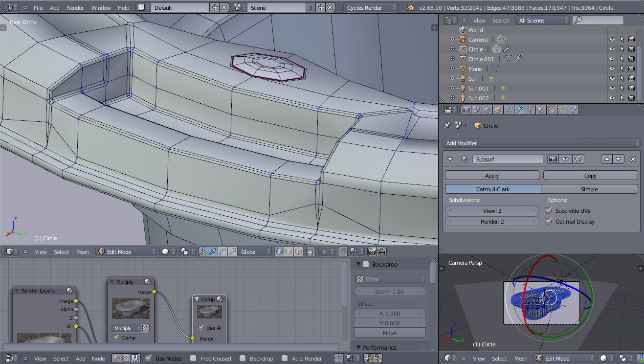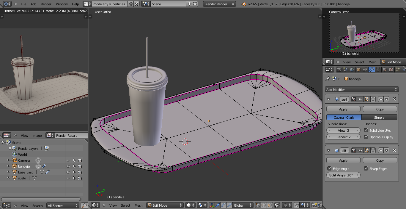 Mi pregunta es esta: Porque siempre que intento sacar en el render la malla de un objeto que además de modificador subdivisión tiene EDGE SPLIT, me saca la malla como si no apretara el botón optimal. No lo hace como el resto de sus hermanos. Que le hago. Por lo demás ya estoy presto a terminar mi obra