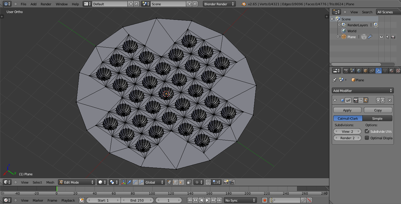 He subdividido bastante el plano, pero si lo hago más veces, al hacer la rueda completa va a tener millones de vértices.