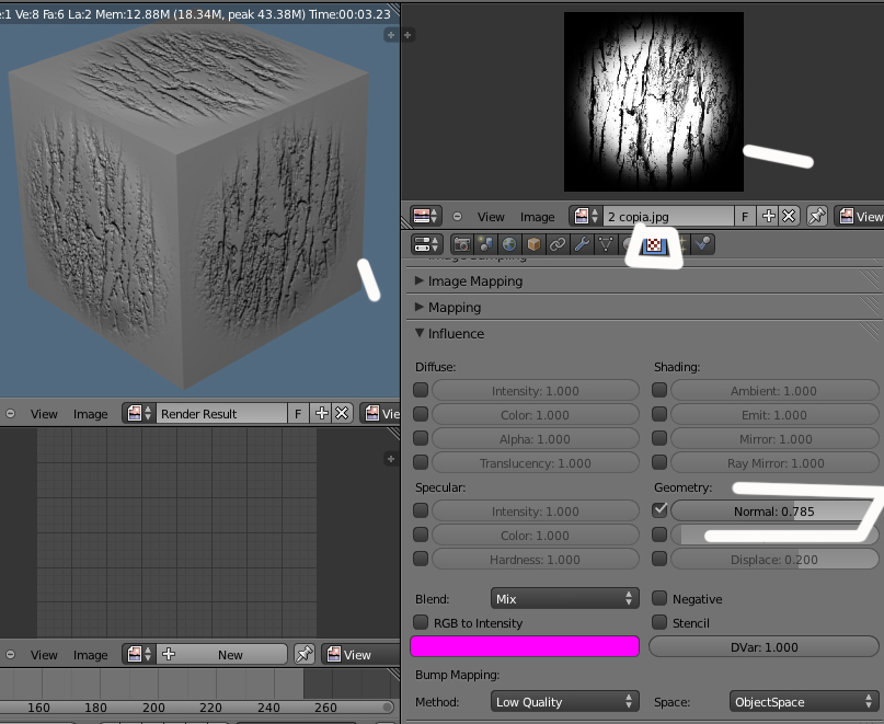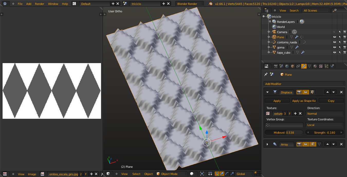 Pero para la parte de la rodadura con rombos tengo algún que otro problema. He usado esa imagen de la izquierda en blanco y negro y le he puesto un modificador displace.