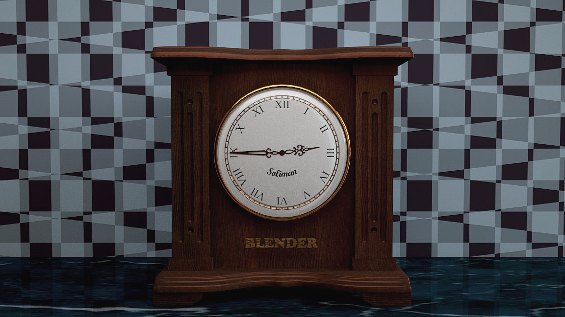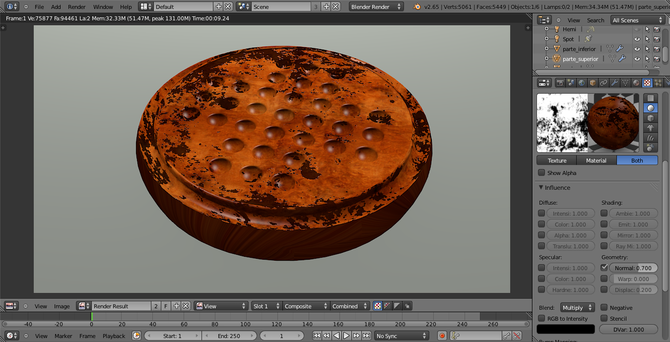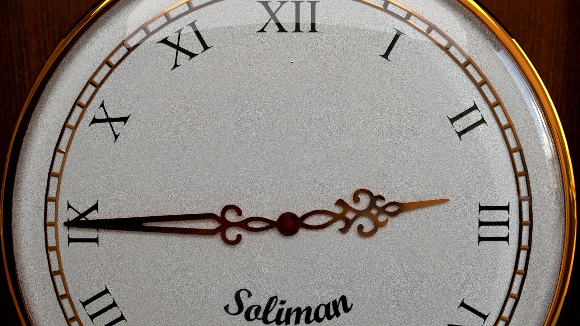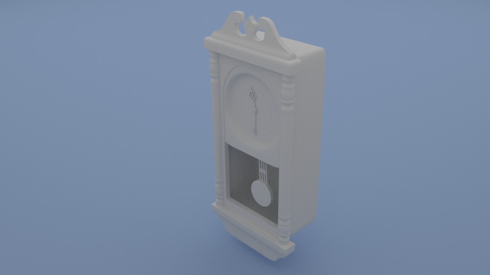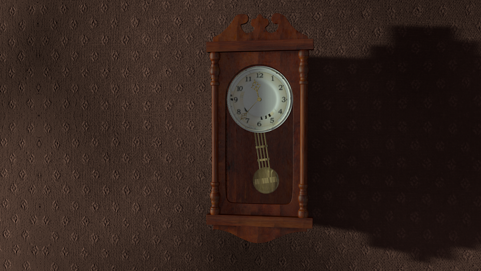 Las manchas de arriba se las he quitado. Era problema del (unwrap). En el pendulo me he metido al modelado porque ciertamente estaba mal situado y lo he centrado más. Y he subido el color de la sombra. He usado una lámpara spot y otra de área en frente, y valores bajitos de AO. El escenario esta metido en un cubo y la lámpara spot la tengo alejada fuera.