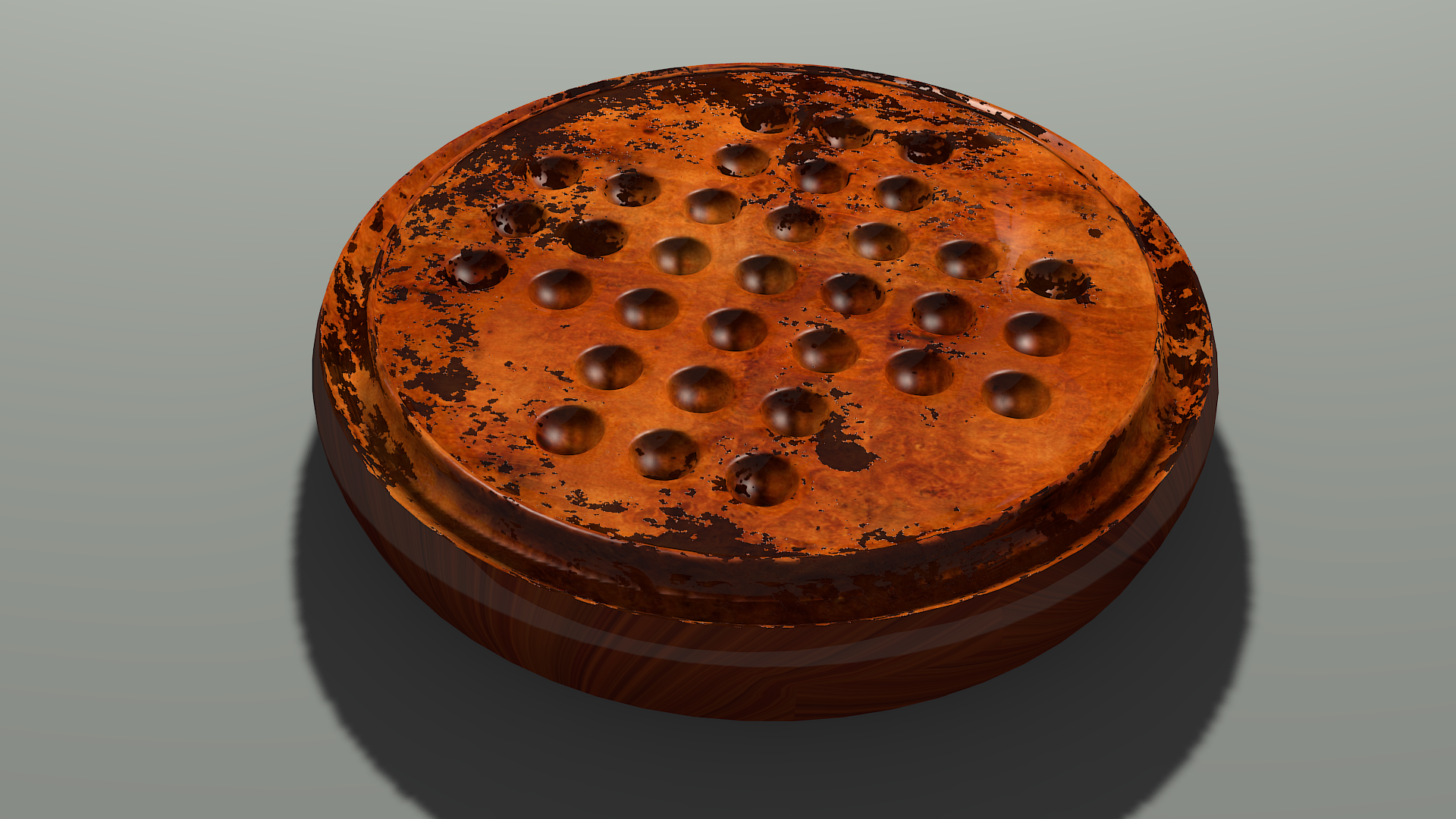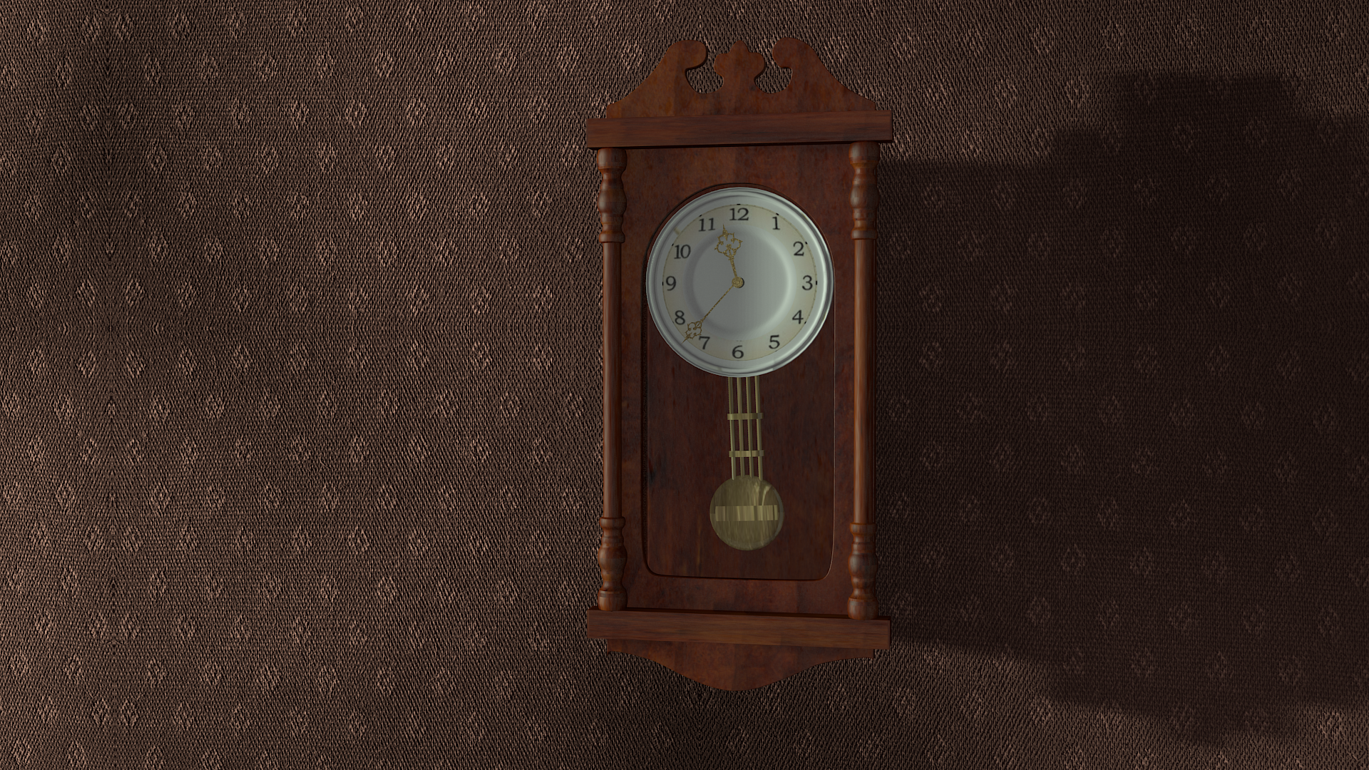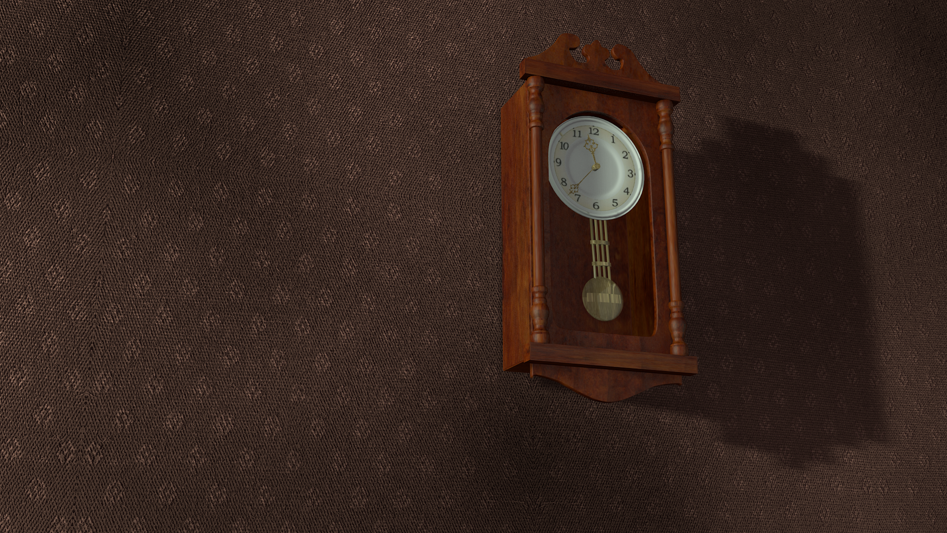 Las manchas de arriba se las he quitado. Era problema del (unwrap). En el pendulo me he metido al modelado porque ciertamente estaba mal situado y lo he centrado más. Y he subido el color de la sombra. He usado una lámpara spot y otra de área en frente, y valores bajitos de AO. El escenario esta metido en un cubo y la lámpara spot la tengo alejada fuera.