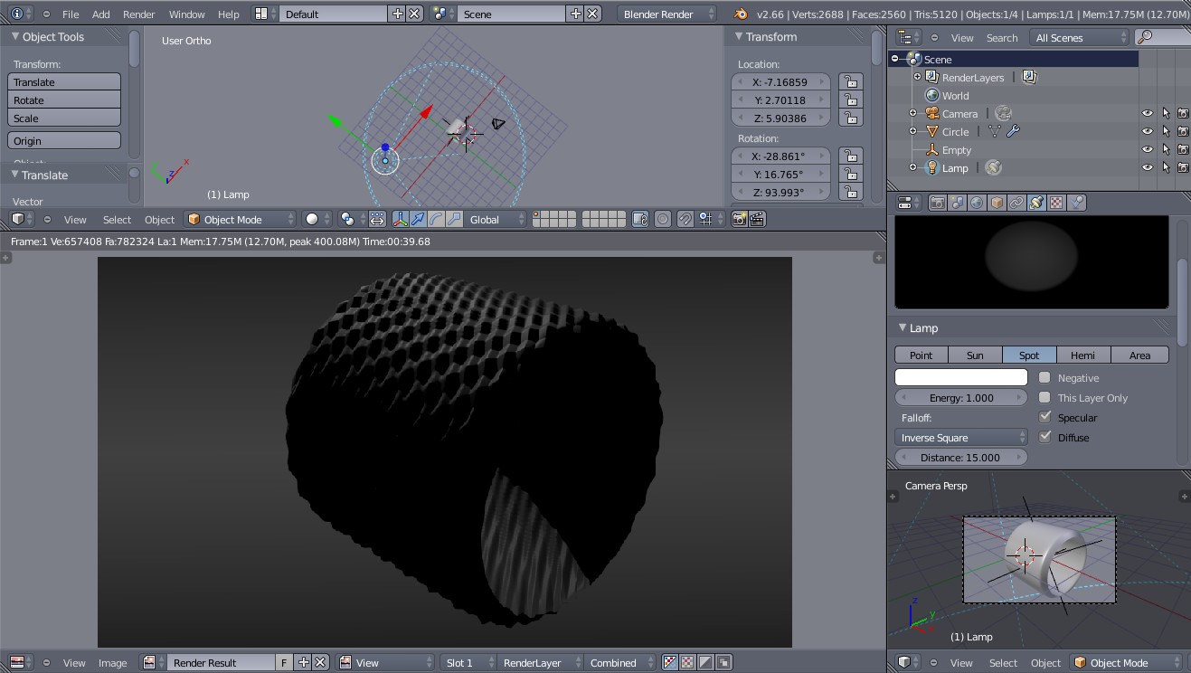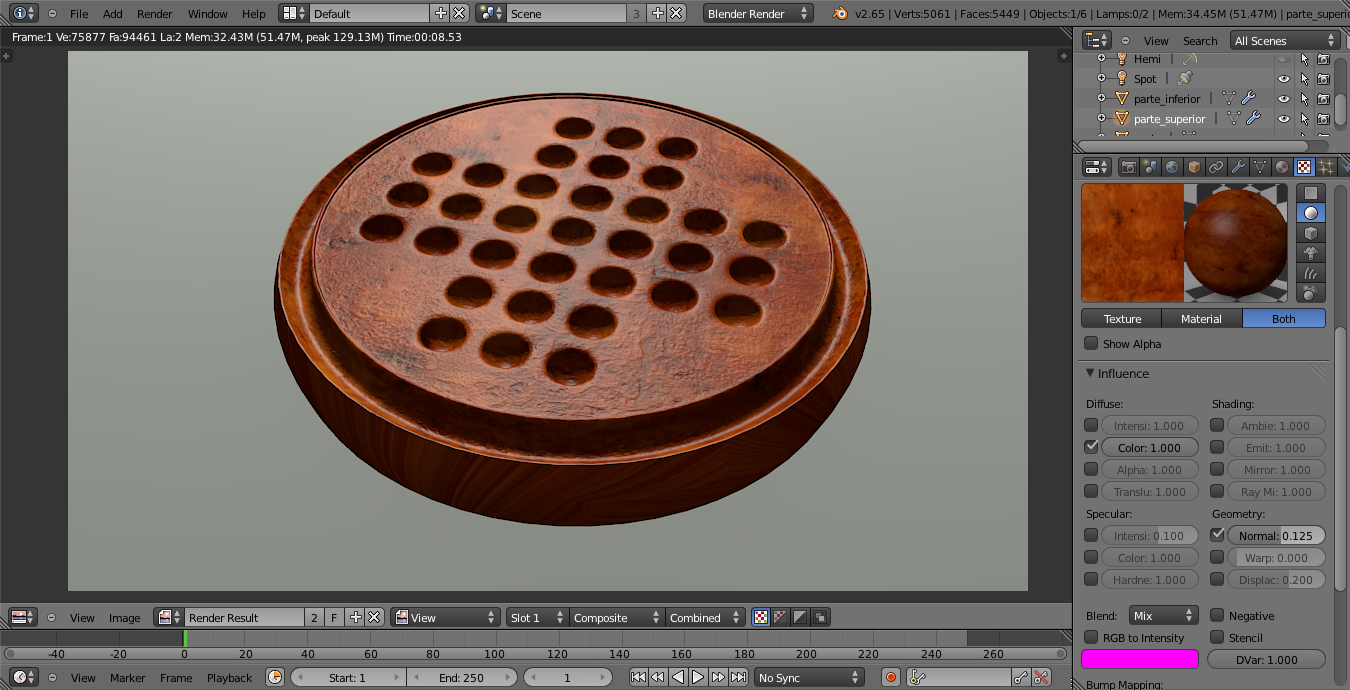Bueno llevo una semana sin tocar esto de los retos, aunque por otras razones no he dejado el Blender. Me he animado a terminar el modelado del objeto en cuestión. Si el modelo tiene buena pinta iría con la parte de iluminación y superficies. He dejado el render al 70%. A ver que tal me ha quedado el cuadro.