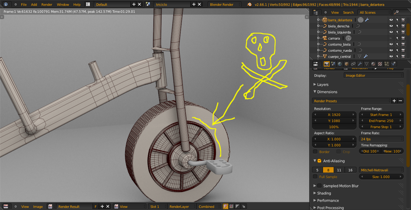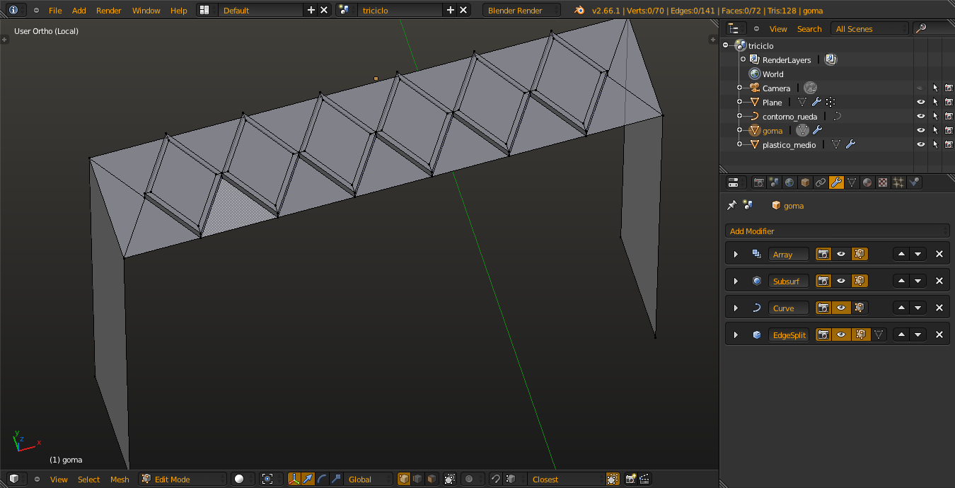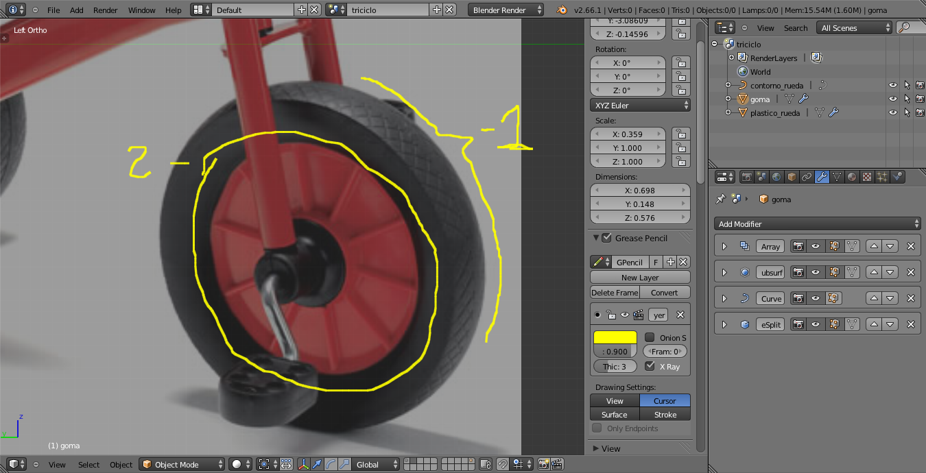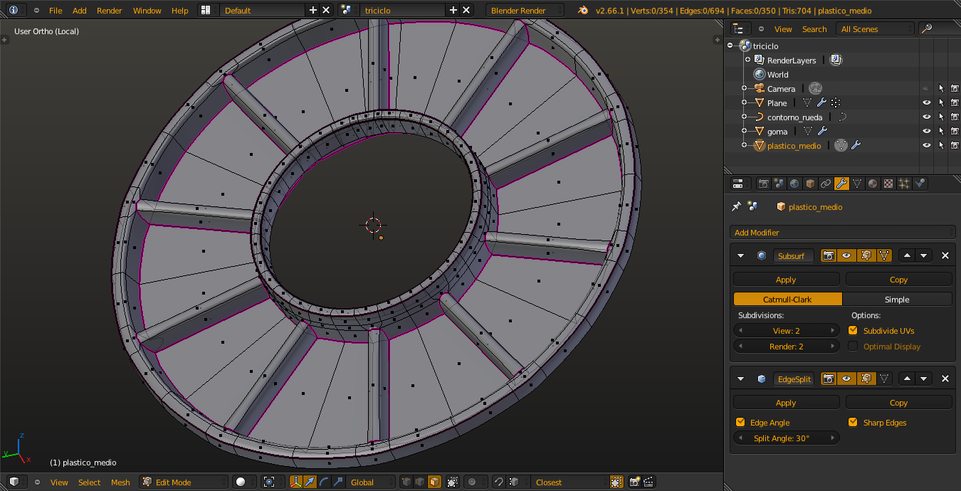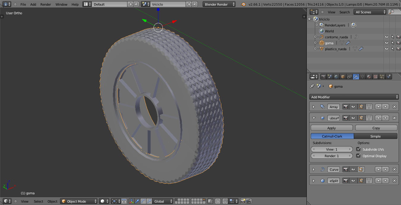 Pues yo sigo modelando mi super triciclo. Mientras me espero un poco con el reto del FV721, voy modelando estas cosas. Me vienen bien. Lo de la rueda voy a tener que dejarlo así porque lo del bump no me funciona.