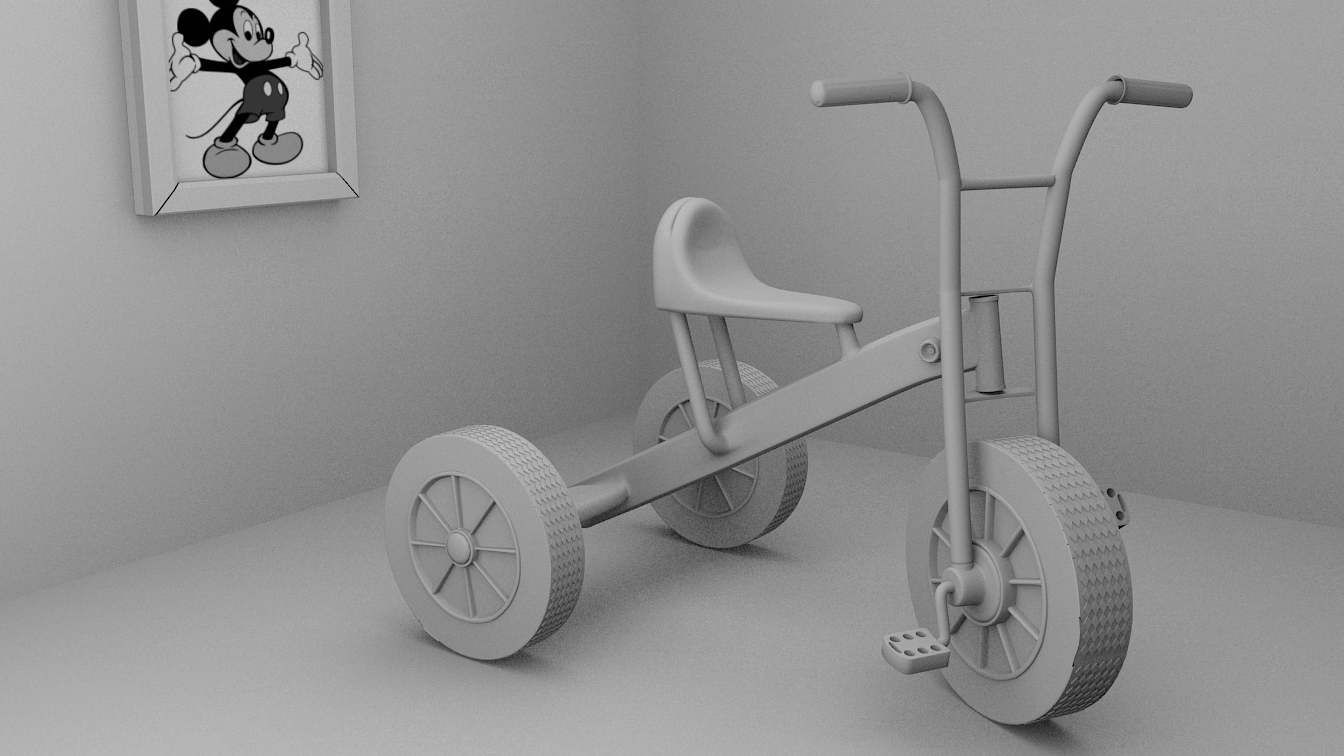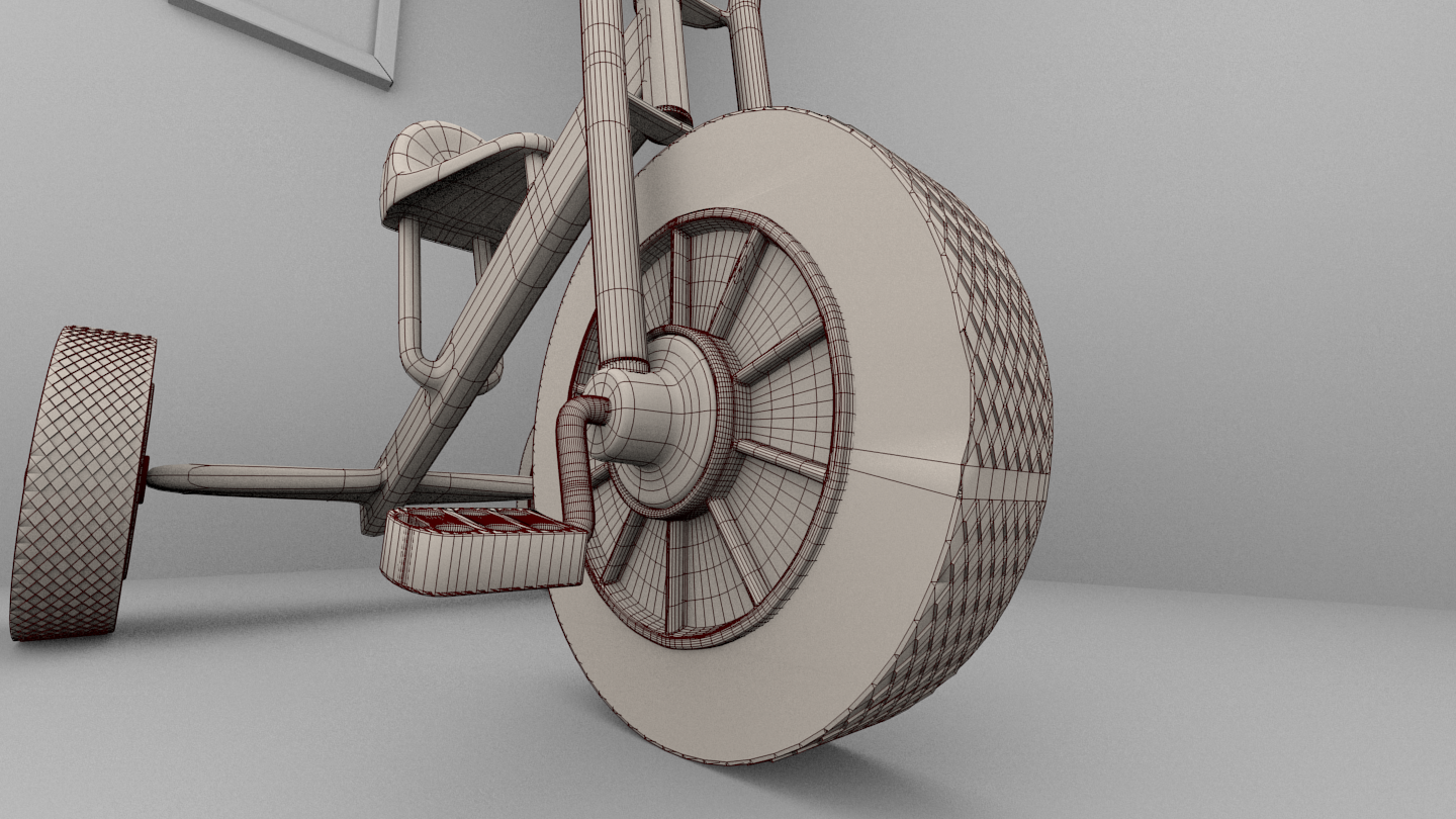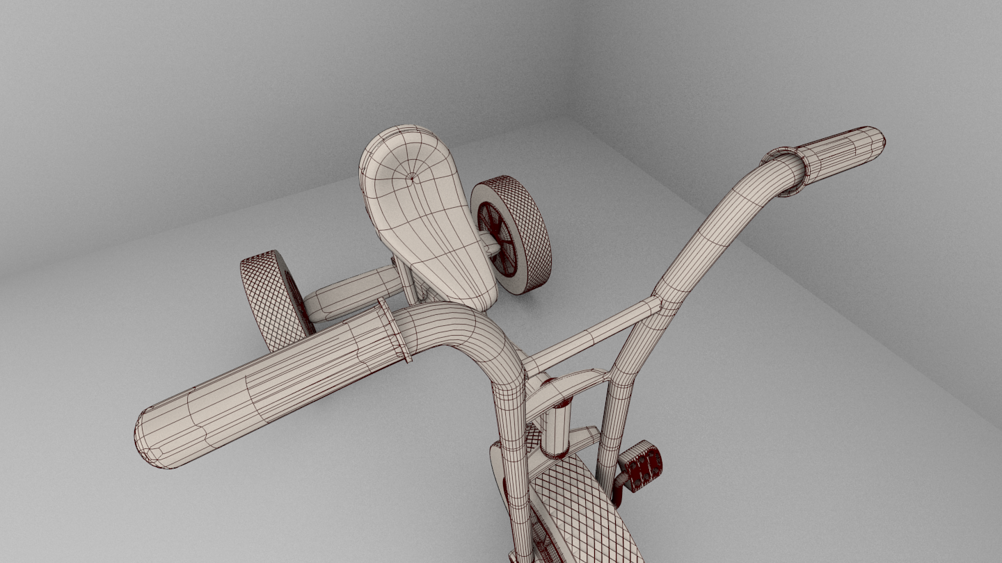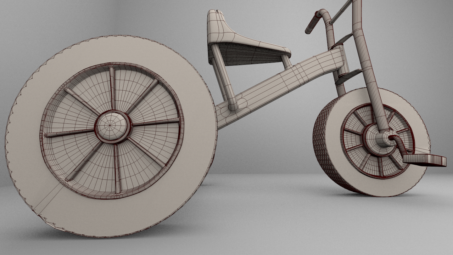 Pues no está nada mal. Solo que la rueda tiene un error: un área lisa en el wire se ve muy claro. Te falta modelar el eje que une la horquilla delantera con el cuerpo del triciclo y por supuesto si puedes colocarle las soldaduras en el cuerpo del triciclo.