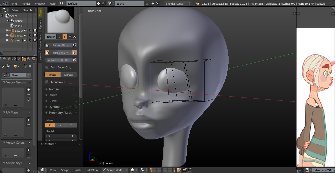 La verdad es que me he peleado bastante con los ojos, y con el pelo, además de darle más realismo a lo que es la forma me hubiera gustado mejorar el material de las dos cosas, pero no he sabido hacerlo ni siguiendo un tutorial. Pero bueno todo se andará, ahora quiero hacer un personaje que represente a Blender, todo un reto. Gracias por todo Solimán.