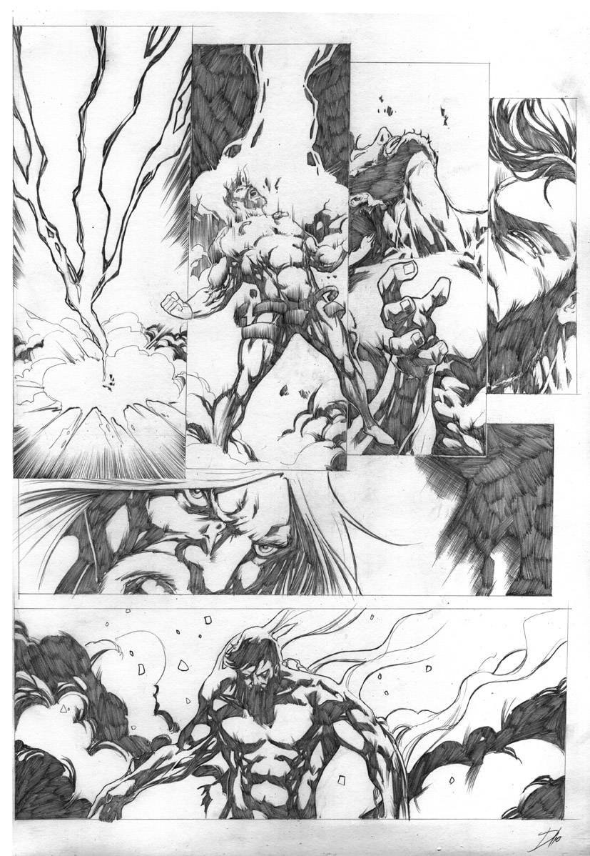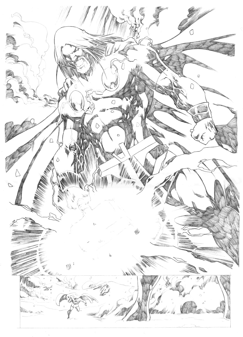 Cuelgo la siguiente página acabada con sfx del mjolnir de Thor, apuntito de zumbarse con Superman. La verdad, no creo que dibuje muchas más, dos más a lo mucho. Me llevan mucho tiempo. El previo, el boceto acabado y el lápiz terminado.