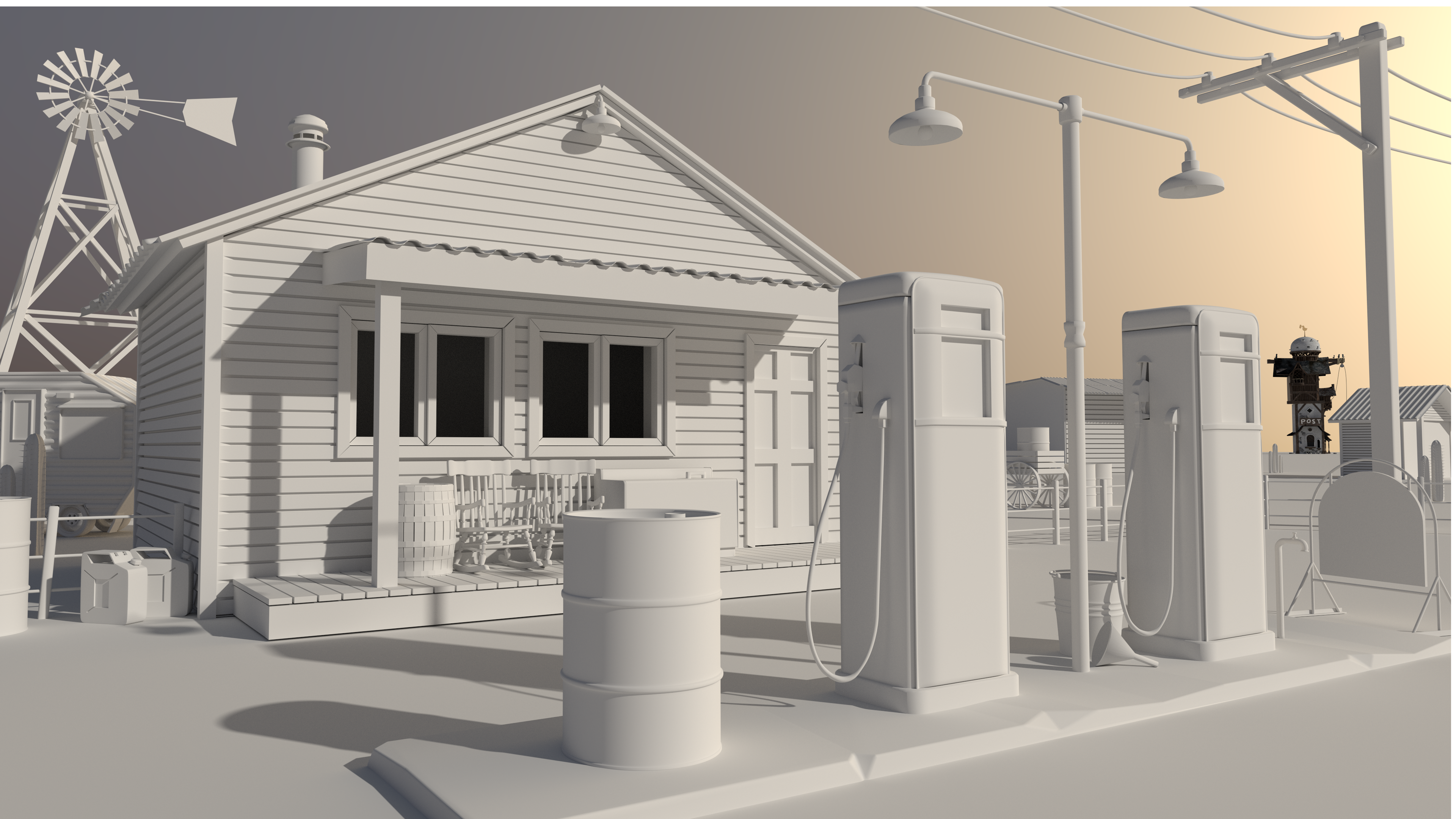 Esta semana voy a full con el reto. He empezado por el escenario. Aquí os dejo un render de cómo lo llevo. Tan solo son las mallas principales, semi situadas, algunas sin el volumen correcto, su objetivo es representar la posición en la escena final para que después sea más atractivo el tema de definir detalles una por una. Además, incluyo un segundo render en el cual ya he modificado la iluminación buscando un resultado parecido a la escena final, sin ser el definitivo.
