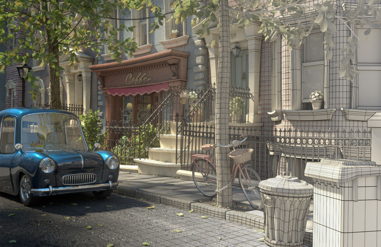 En cuanto a los azulejos lo mismo, las juntas en la pared son un bump/dissplac map que las pronuncie, las ventanas de los edificios del fondo, los rasguños de los cristales, todo lo que da vida son texturas.