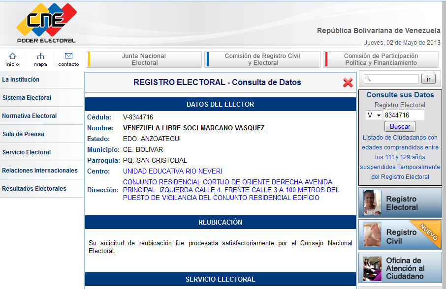 Hombre no es que yo me lo crea o no por eso digo que lo revises en la página del CNE http://www.cne, gov, ve/web/index.php como siempre te he dicho si estuvieras aquí y vieras el desparpajo de estos día a día no te extrañaria tanto que coloquen nombres como ese y es que ese hacerte saber que tienen el control de todo y que pueden hacer con el sistema lo que les dé la gana es la más grande trampa de estos gobiernos.