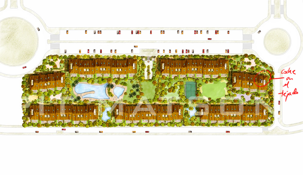En la site plan anterior hay elementos muy básicos de 3d (cajas, poco más), AutoCAD tratado con el Final Toon y Painter.