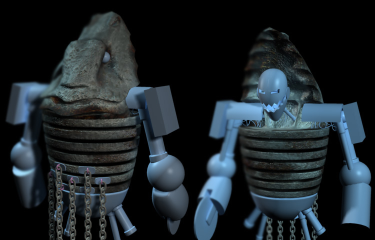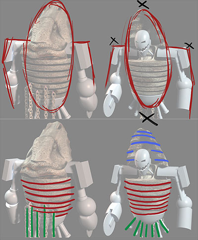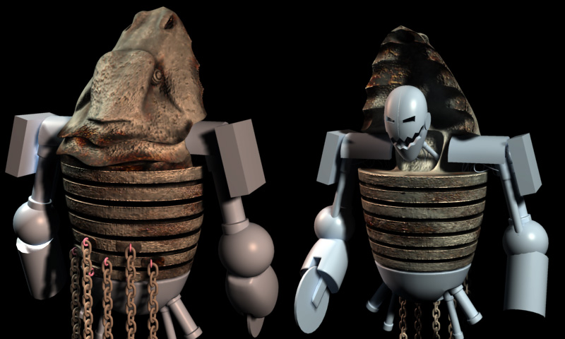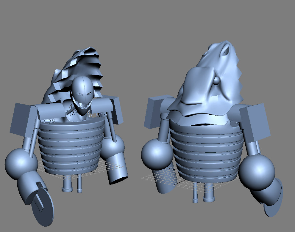 A mí me gusta mucho, así como en el boceto los robots, le da más aspecto amenazador esos dientes de sierra y la cabeza de dragón, el dragón es símbolo de fuerza y poder. Además, me encantan los pequeños detalles como las cadenas que tiene en el boceto, yo seguiría en esta onda es un diseño muy original. Un saludo.