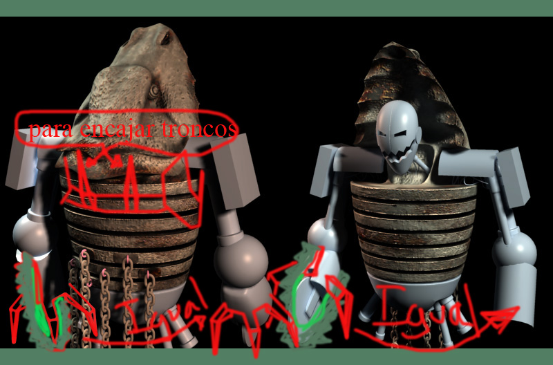 El sketch que has puesto (gracias por molestarte) es curioso, pero el detalle, por ejemplo, de la espalda para poner troncos no lo haré, simplemente, porque de dónde cuelgan los troncos es de las cadenas, es decir, van por el suelo dejando una gran humadera por detrás en el brazo que no se ve nada, en teoría va un lanzallamas, pero puede cambiarse um no sé no sé. Gracias a los dos por tomarse su tiempo en contestarme y dar su punto de vista tan bueno gracias a todos.