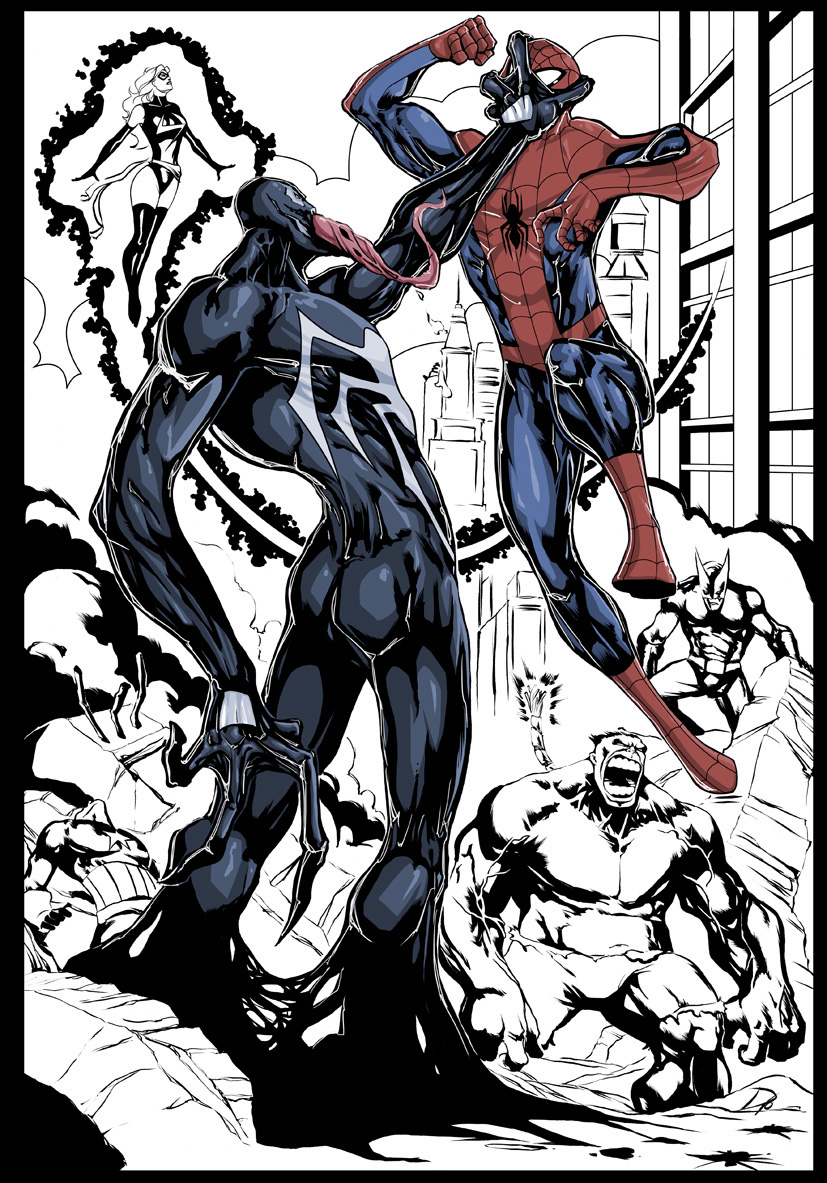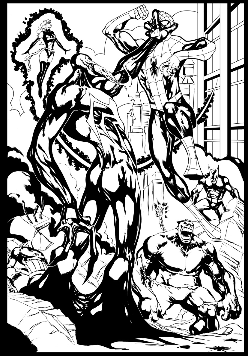 Coloco una tinta de Venom. Me he permitido hacer una versión algo más personal de lo normal, deformando el bicho. Hace un tiempo que no entinto y lo echaba de menos.