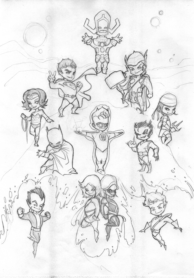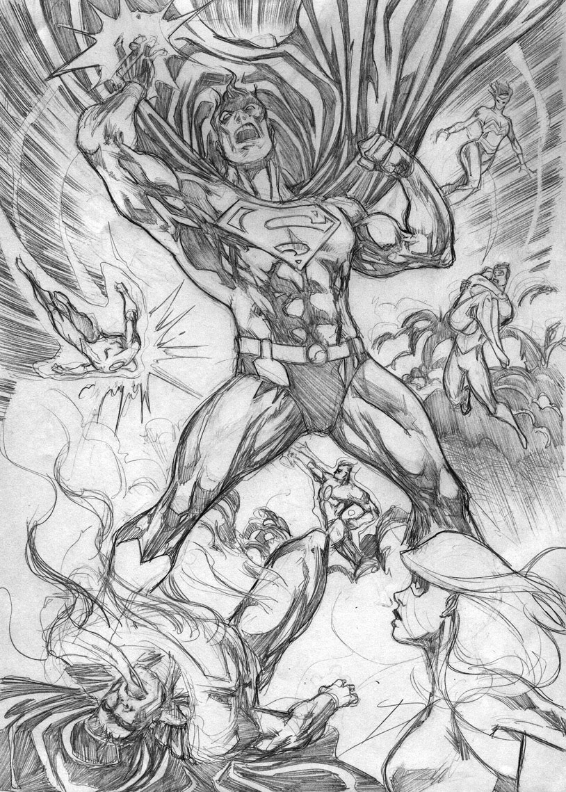 Cuelgo la siguiente página acabada con sfx del mjolnir de Thor, apuntito de zumbarse con Superman. La verdad, no creo que dibuje muchas más, dos más a lo mucho. Me llevan mucho tiempo. El previo, el boceto acabado y el lápiz terminado.