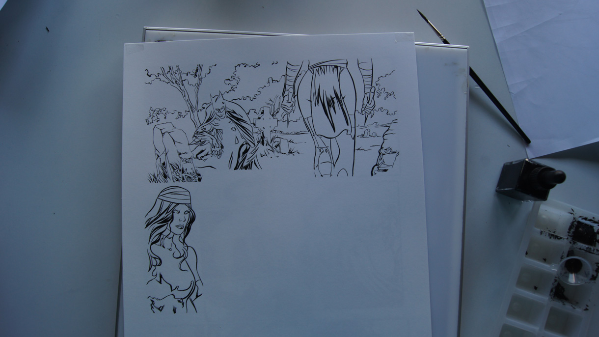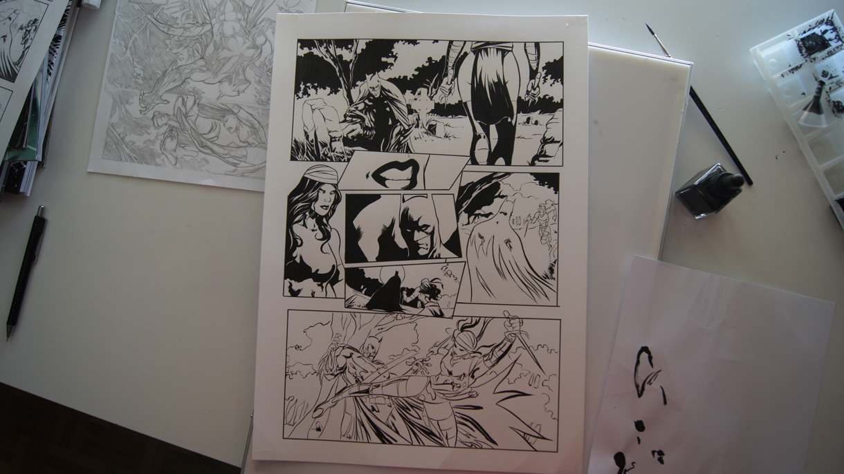 Al fin he terminado de entintar la primera página. Odio el verano, pero sobre todo al entintar. La velocidad de secado de la tinta es tal que si te agachas a por algo del suelo y vuelves a seguir donde lo habías dejado, la punta del pincel se ha quedado como una piedra, si ya normalmente hay que tener cuidado con los tiempos de secado, ahora en verano y en Madrid, exagerado. : todos a entintar a noruega.
