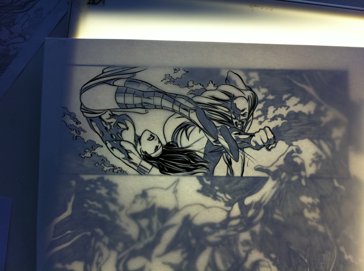 Kmk creo que no voy a entintar ninguna, al menos hasta que no me lo digan. Yo preguntaré primero, quiero decir que les diré que puedo entintar mi propio trabajo y hacerlo si quieren. Pero la superespecialización que hay en EU es asombrosa. Si entras como entintador, mueres entintando y me pondría muy triste entintar el dibujo de otras personas.