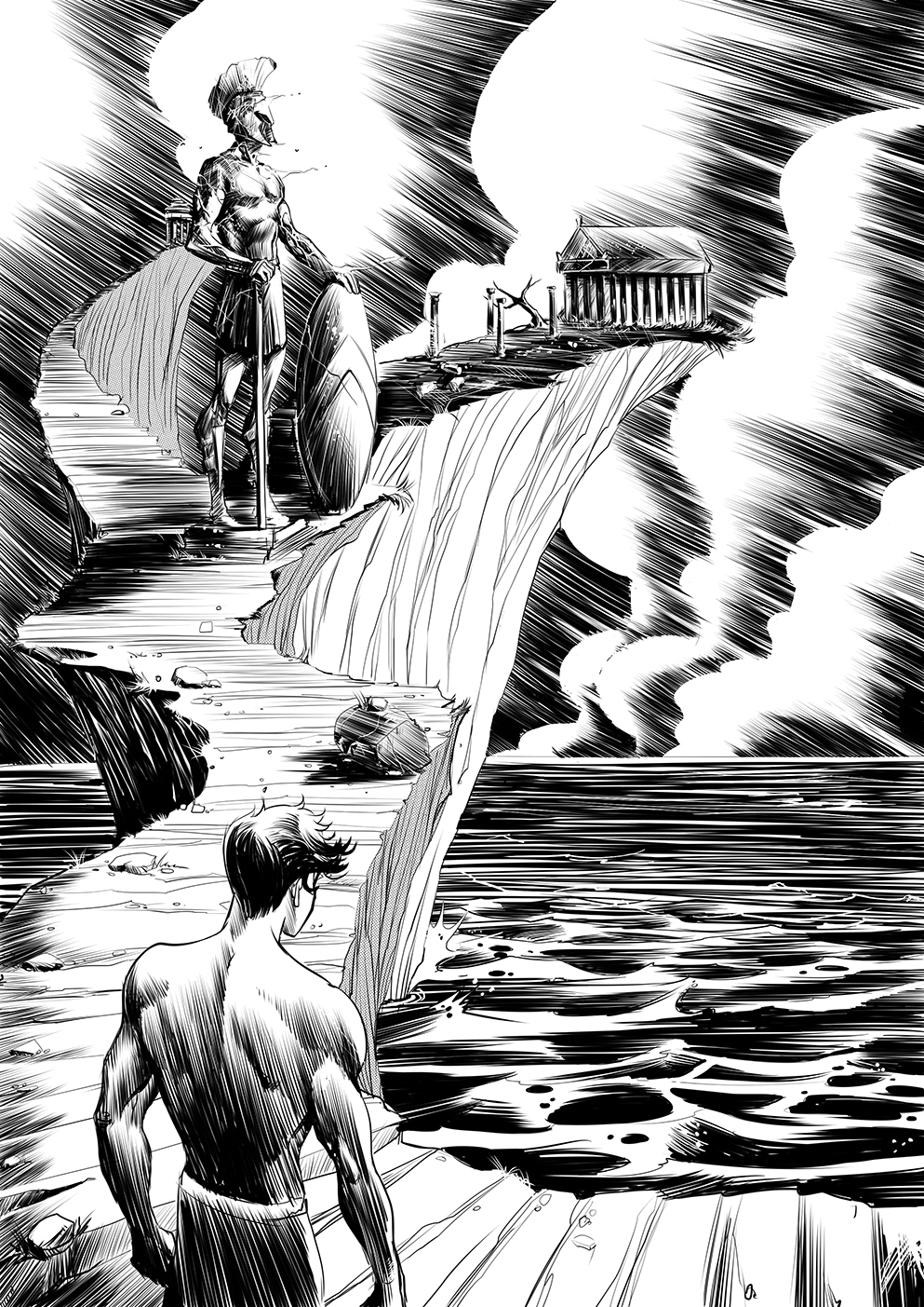 Solo un detalle, veo algo raro en la perspectiva del camino-acantilado-griego, no parece la distancia correcta de los personajes hasta el templo, no sé.