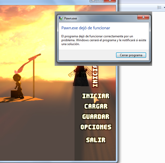 A arrancado y salido bien sin ningún fallo.iniciar no funciona. Sale una ventana de windowseditado, a la cuarta vez he podido entrar una vez en el juego, el muñeco cae.