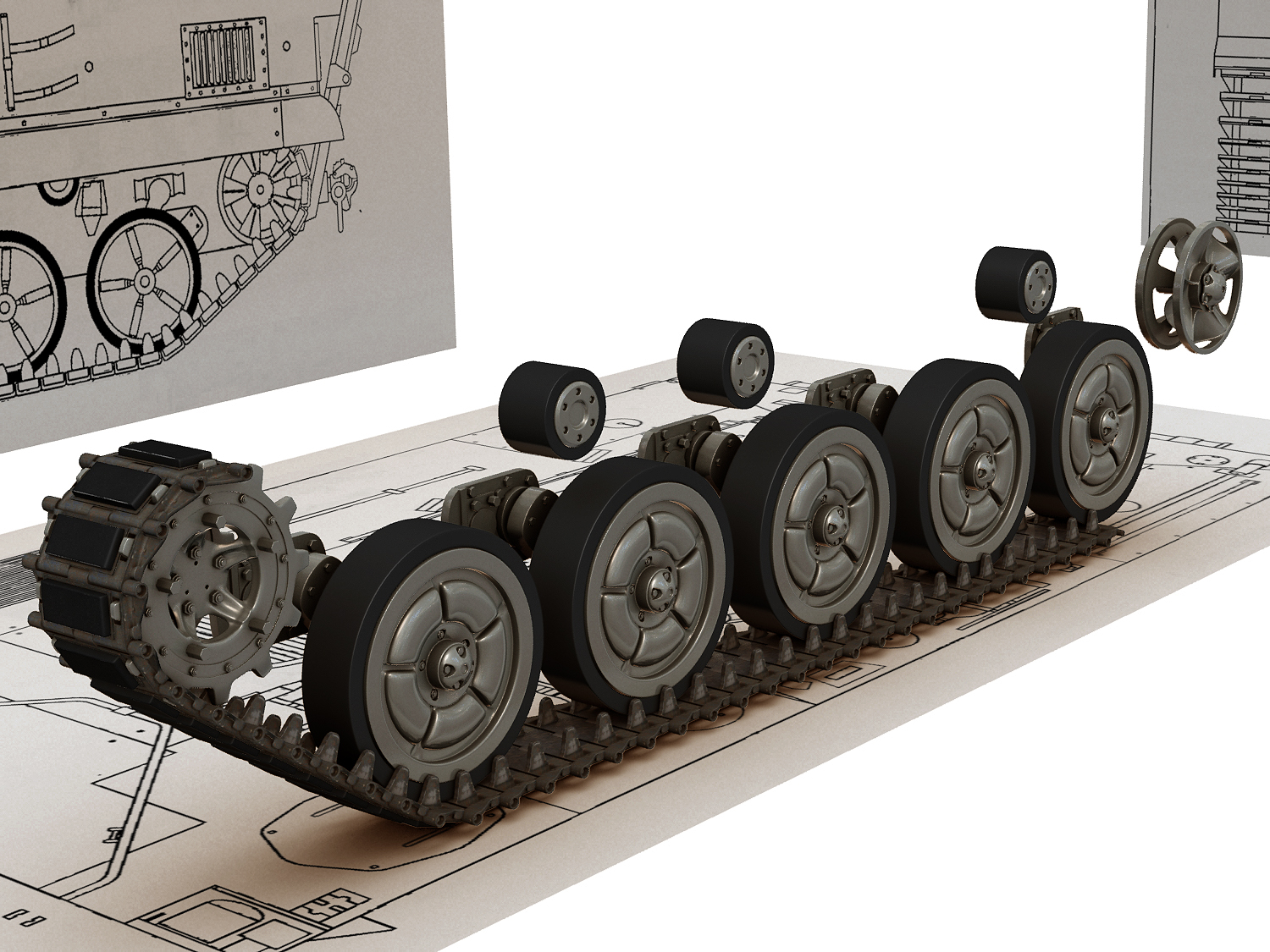 A este le iba a por él tren de los VK Leopards, pero al enterarme del tamaño mejor usare el del E-10 modificado para rueda de 40 centímetros, ya que las del E-10 eran de un metro de diámetro también creo que usaba la suspensión del LT-40.