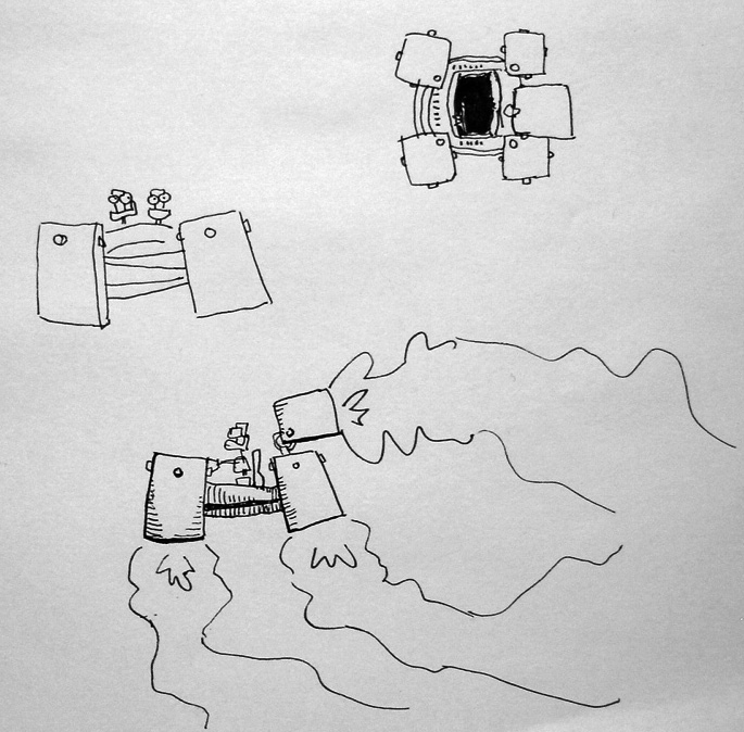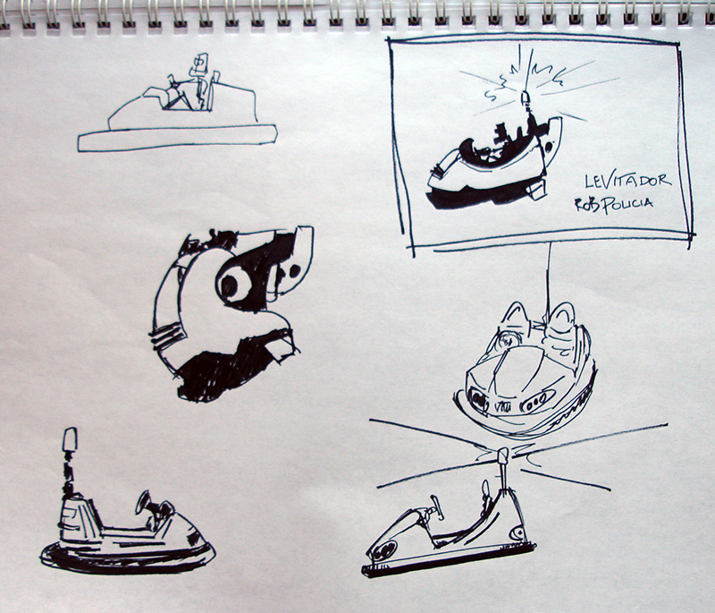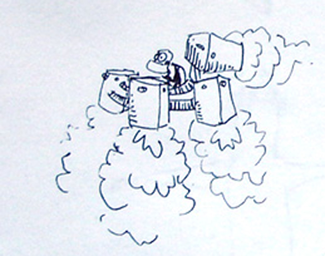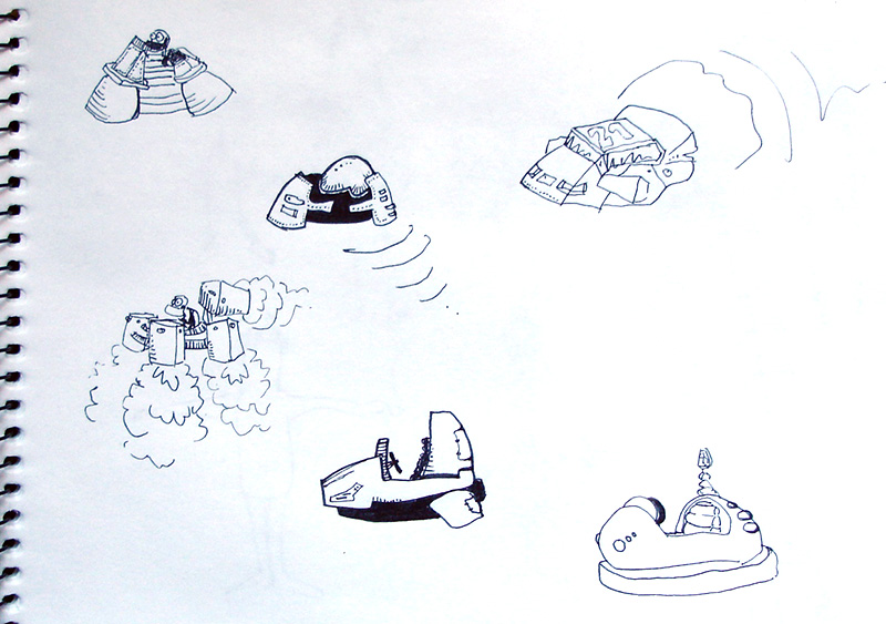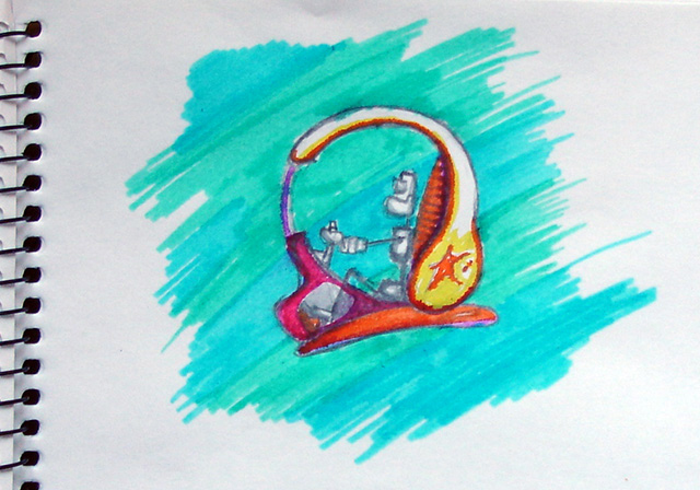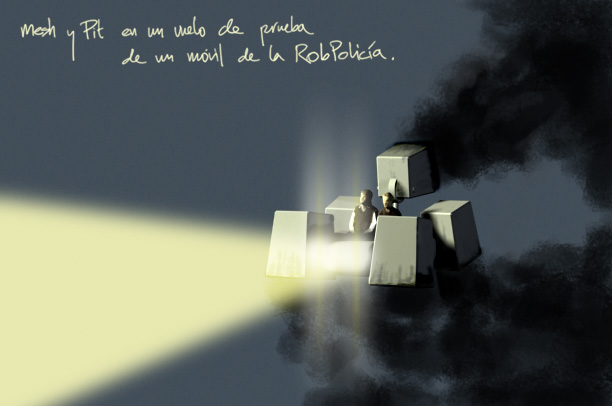 Adjunto el boceto con algo más de detalle, un vehículo volador cúbico, con motores bien contaminantes.Cita: