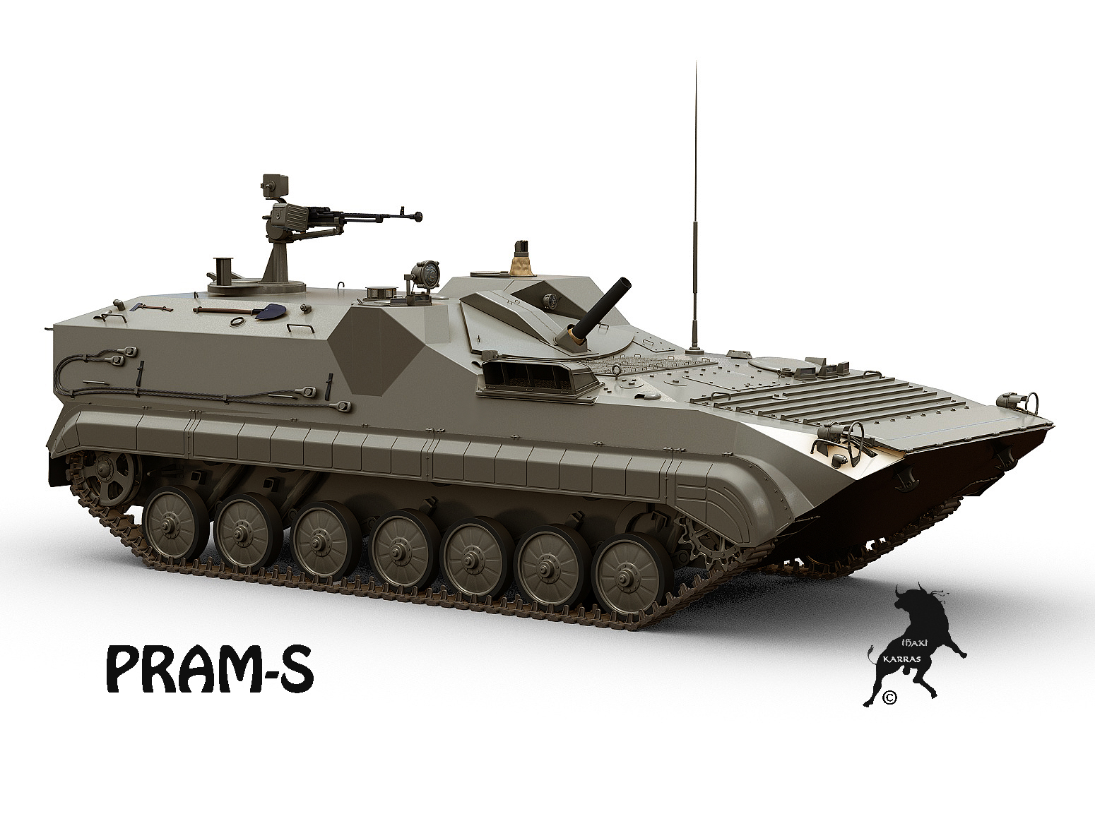 ¿Qué pasa cuando coges un BMP-1 ruso, lo cortas por la mitad, tiras la trasera y le vas soldando cosas detrás? Pues esto. El, llamesmole PRAM a secas, porque lo he visto hasta con tres nombres, y sólo coincidan en lo de PRAM. Vamos, un mortero de 120 milímetros de retrocarga.