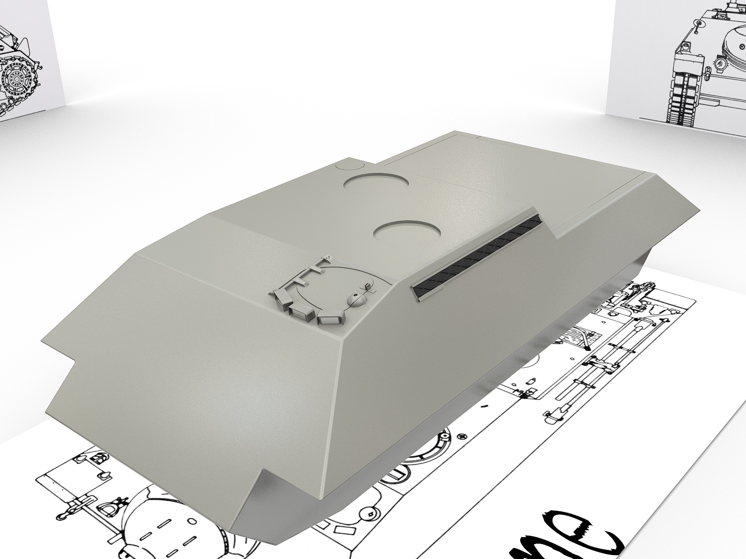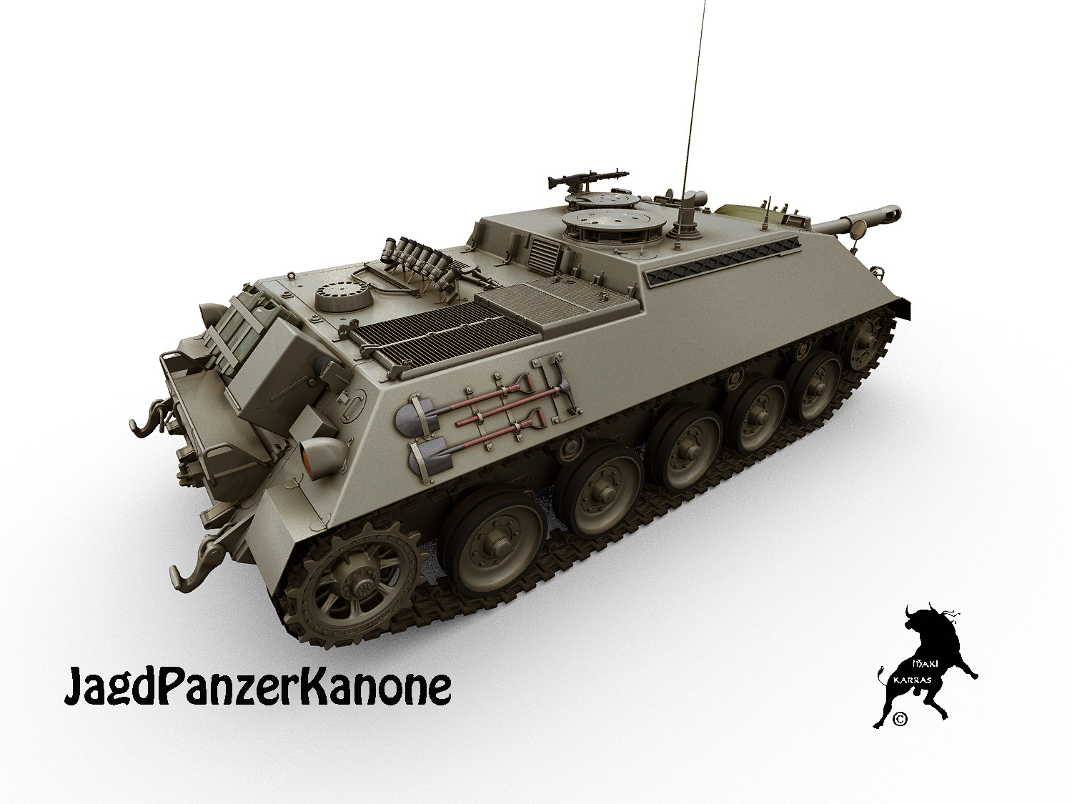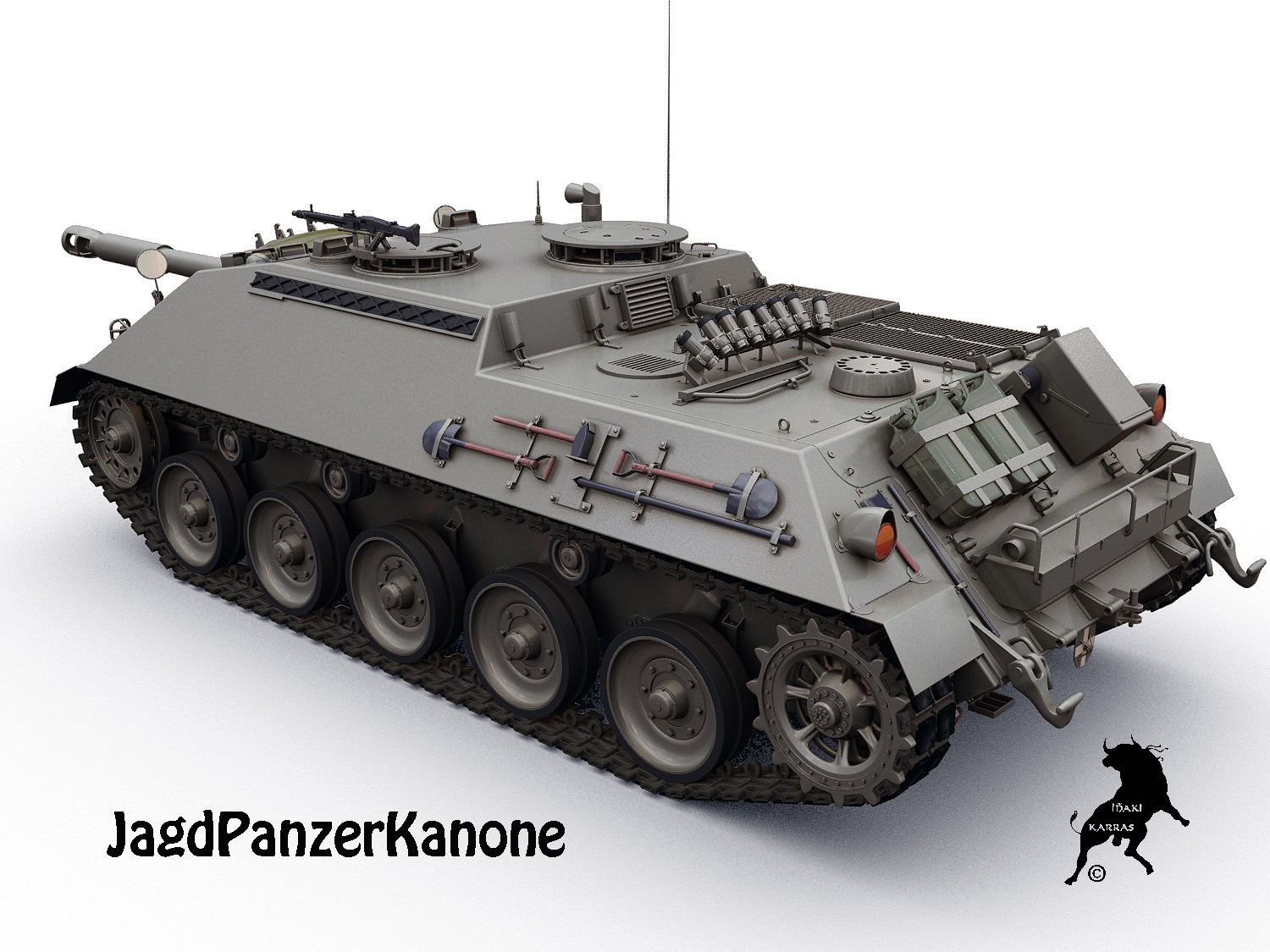 El JagdPanzwerKanone acabadito. Ahora estoy modificando para hacer el RaketePanzer Jaguar, no, no es que tenga una raqueta en la torre, que no. Es la versión sin ese peaso cañón y en el techo llevaba un lanzador de misiles antitanque. El original llevaba misiles franceses SA-11 o SA-12 (muy antiguos), luego lo mejoraron añadiéndole blindaje extra, ya que el original de estos bichos era muy delgado, unos 50 mm. También le cambiaron el misil, por el francoalemán HOT, que es la versión que haré yo. A algunos les pusieron también el TOW americano, pero el bicho ya es el mismo.