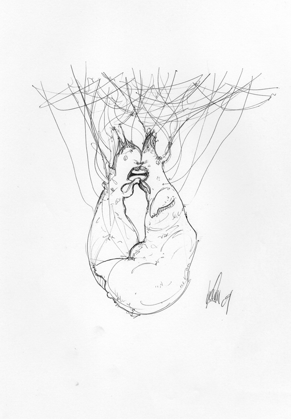 Parecen caras, pero al darles la vuelta es cuando me he percatado de los fetos o niños al verlos al revés, en realidad me he puesto cabeza abajo para distinguirlos, al verlos otra vez en posición normal ya he empezado a saber que es, pero no lo sé ¿Qué es? ¿Qué te pasaba por la cabeza al crearlos?