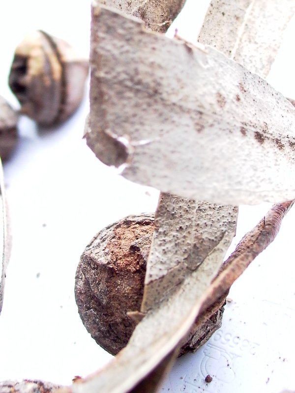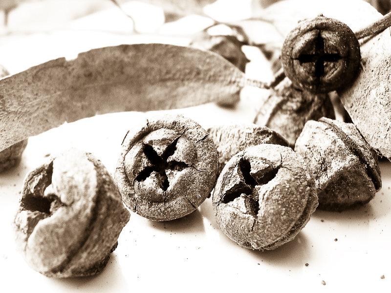 Preciosas semillas de eucalipto en descomposición.