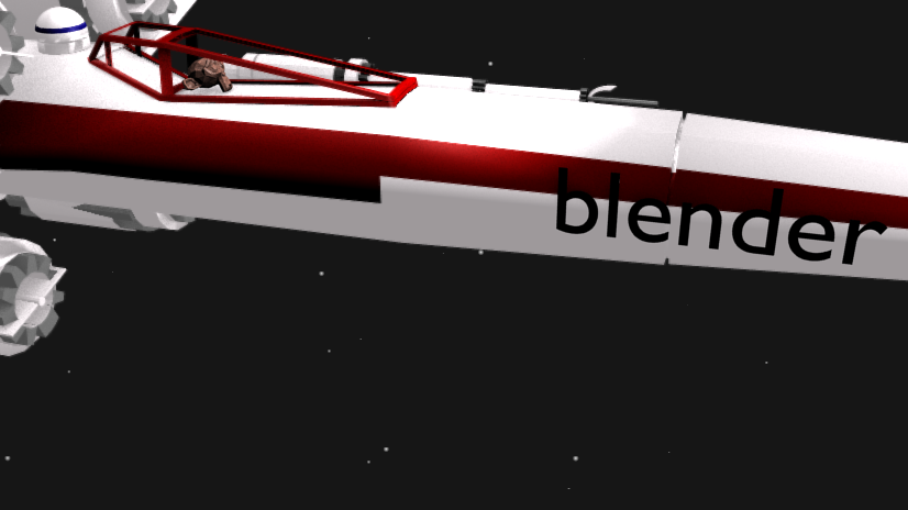 Pues aquí va otro avance. Por cierto, quisiera agregarle la frase Blender a la nave. Pero en la versión 2.5 no encuentro la opción lattice, ni dándole a la barra espaciadora para el menú.