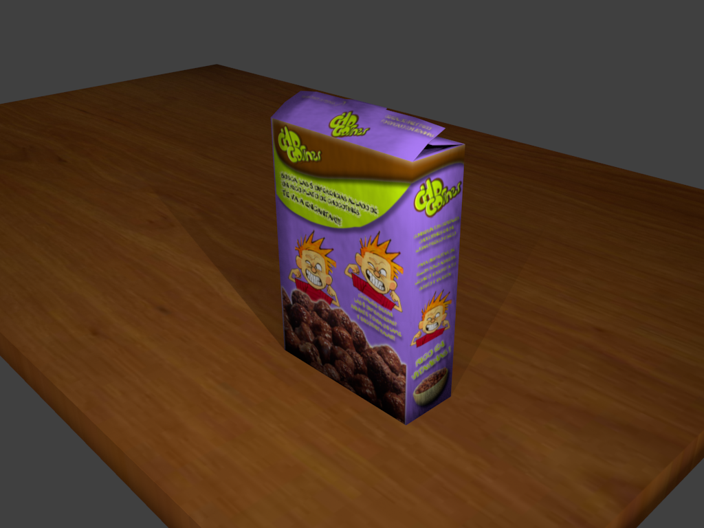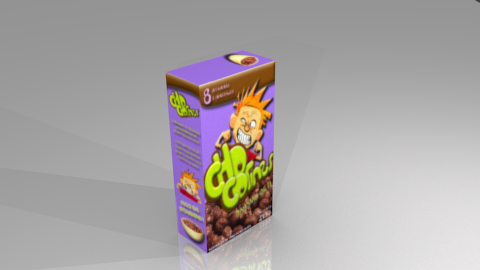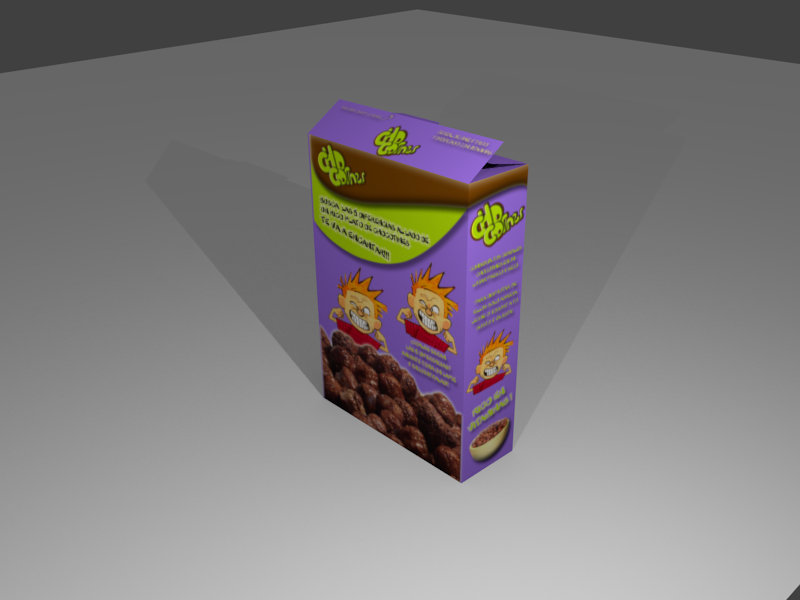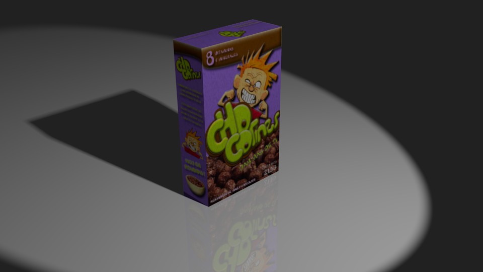 Bienvenido husalban, veo que hoy has desayunado cereales. He intentado ensuciar la textura, intentando envejecer la caja, pero no me convence lo que he hecho. Voy a buscar información sobre el tema. También he aumentado el especular, como comentó Iherrero, pero no veo que le hayan salido brillos, supongo que, será porque es una geometría muy simple y siguiendo los consejos de v1k1ngo, he puesto dos spot y creo que lo del volumen si lo he logrado.
