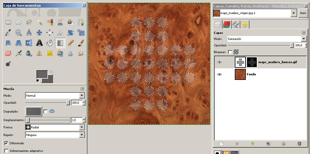 Ahora tengo que hacer los pequeños degradados concéntricos en cada agujero, pero no consigo hacerlo si los selecciono todos me lo hace en la capa entera, supongo que, tendré que ir seleccionando los agujeros uno a uno. Bueno ya iré probando.