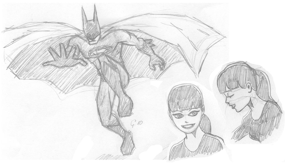 Ahora más dibujos pensados y hechos en cuestión de horas, por probar estilos. Son muy mejorables, sobre todo la postura de Batman, pero lo dejo como prueba. Saludos.