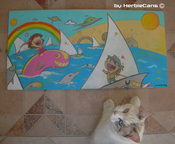 Me encantan las expresiones que has conseguido en los niños en la pintura de mar de velas, están muy simpáticas. Aunque me debato si me gusta más eso, o la del gato que está al lado pensando. ¿de qué carajo se ríen esos dos?