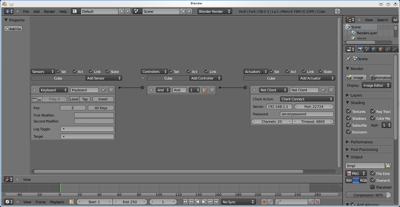 La nueva característica es añadir la posibilidad de jugar en red al BGE. De momento ya tengo hecho gran parte del background y puedo ir haciendo tests de conexión a servidor, mensajes, etc. A partir de ahora iré poco a poco creando la interfaz con los nuevos actuadores y sensores. Estoy basándolo en el sistema de internet/multiplayer que tiene el Unity 3d.