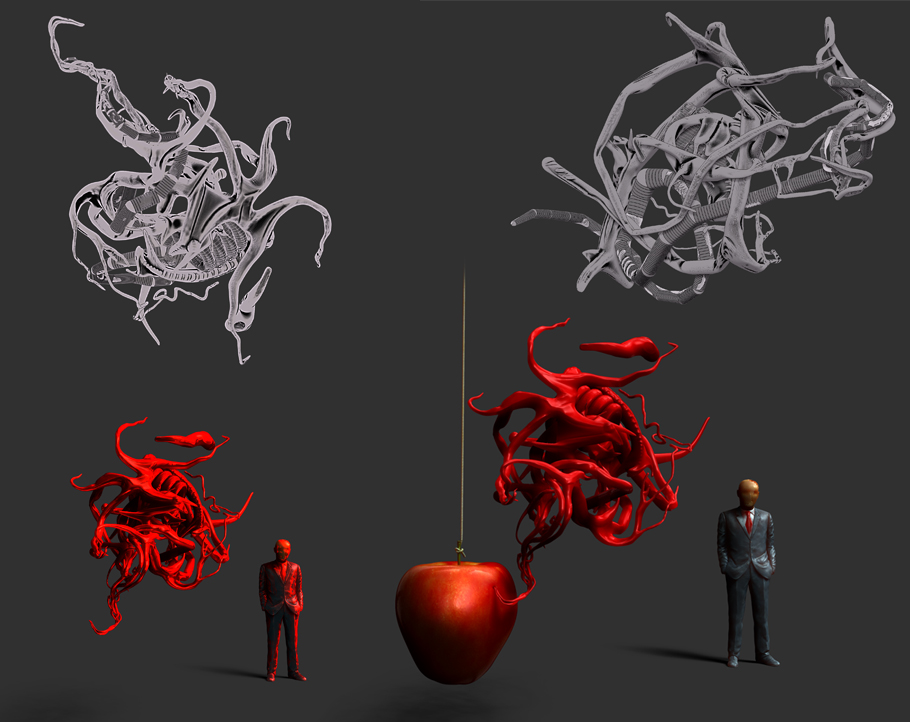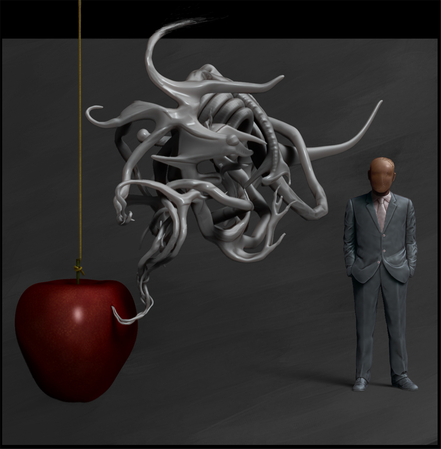 Bien, casi a punto para empezar la fase final, edición de la escena. Estoy lanzando varios renders, ya que, cada elemento necesita su punto, os dejo dos: uno para la manzana y otro del omescuro.