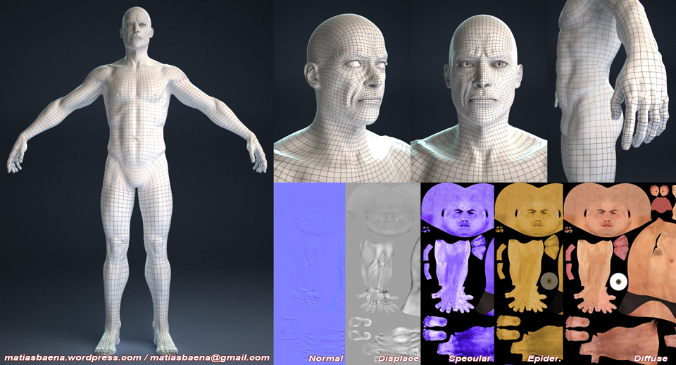 Texturizado de humano hiperrealista. Una vez terminado de modelar los detalles en la malla de alta (ZBrush), saque los mapas de Ambient Occlusion, Normal Map y Displace map, para poder montarlo en la malla de animación. Ya con el modelo montado con sus mapas, pude empezar con el texturizado (Mudbox), usando las fotografías que tenía de referencia para él modelado.