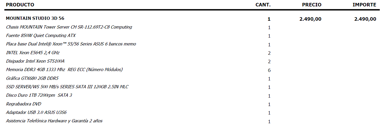 Si nos centramos en el nuevo ordenador, te adjunto una imagen de un primer presupuesto que he pedido a Mountain donde les especificaba mis necesidades y el uso que iba a darle. Es el precio sin portes y sin iva.